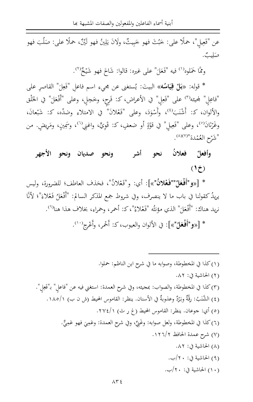 * قوله: «بَلْ قِيَاسُه» البيتَ: يُستغنى عن مجيء اسم فاعلِ "فَعِلَ" القاصرِ على "فاعِلٍ" لمجيئه (¬٣) على "فَعِلٍ" في الأعراض، كـ: فَرِحٍ، وخَجِلٍ، وعلى "أَفْعَلَ" في الخَلْق والألوان، كـ: أَشْنَبَ (¬٤)، وأَسْوَدَ، وعلى "فَعْلانَ" في الامتلاء وضدِّه، كـ: شَبْعانَ، وغَرْثانَ (¬٥)، وعلى "فَعِيلٍ" في قوَّةٍ أو ضعفٍ، كـ: قَوِيٍّ، واغنِي (¬٦)، وسَمِينٍ، ومَرِيضٍ. من "شَرْح العُمْدة" (¬٧) (¬٨).