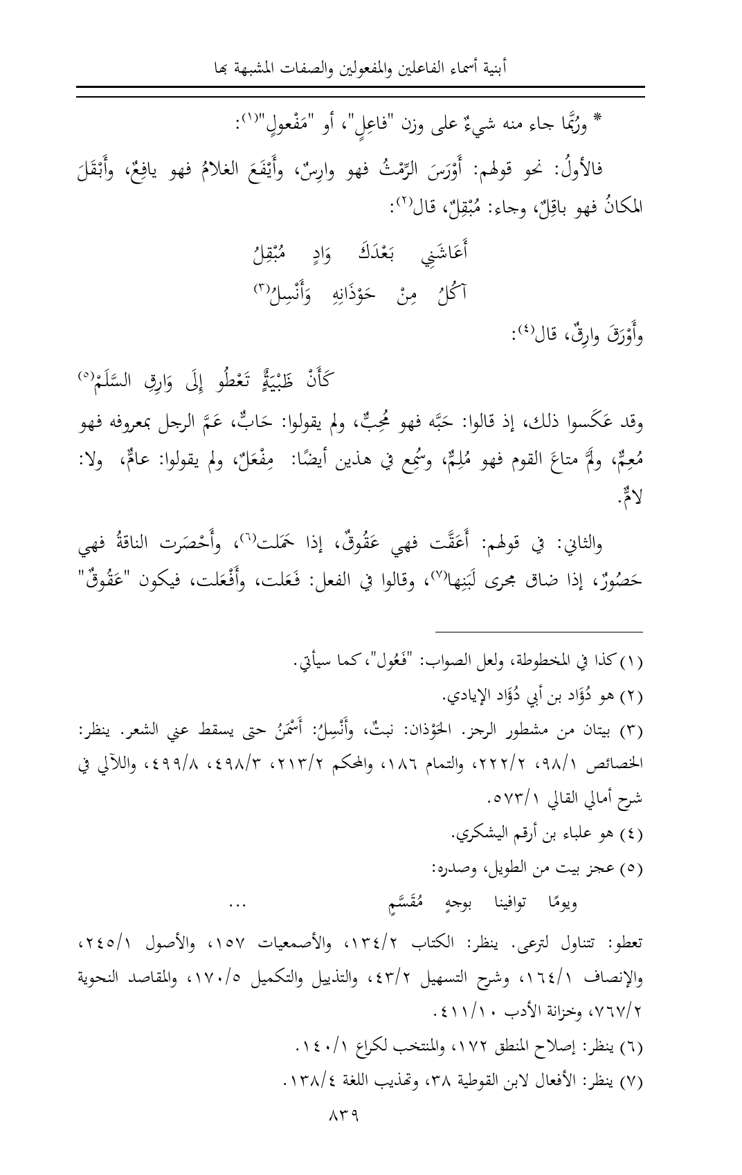 فالأولُ: نحو قولهم: أَوْرَسَ الرِّمْثُ فهو وارِسٌ، وأَيْفَعَ الغلامُ فهو يافِعٌ، وأَبْقَلَ المكانُ فهو باقِلٌ، وجاء: مُبْقِلٌ، قال (¬٢):