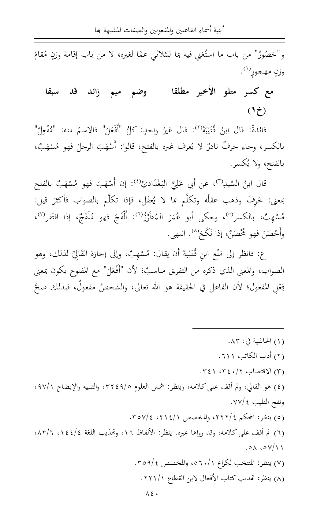 ع: فانظر إلى مَنْع ابنِ قُتَيْبةَ أن يقال: مُسْهِبٌ، وإلى إجازة القَالِيِّ لذلك، وهو الصواب، والمعنى الذي ذكره من التفريق مناسبٌ؛ لأن "أَفْعَلَ" مع المفتوح يكون بمعنى فِعْلِ المفعول؛ لأن الفاعل في الحقيقة هو الله تعالى، والشخصُ مفعولٌ، فبذلك صحَّ
