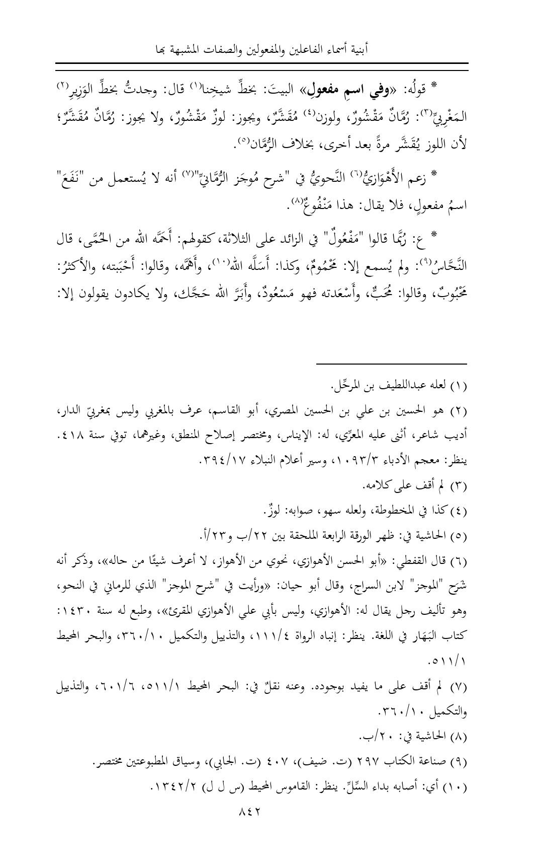 (¬٦) قال القفطي: «أبو الحسن الأهوازي، نحوي من الأهواز، لا أعرف شيئًا من حاله»، وذَكر أنه شَرَح "الموجز" لابن السراج، وقال أبو حيان: «ورأيت في "شرح الموجز" الذي للرماني في النحو، وهو تأليف رجل يقال له: الأهوازي، وليس بأبي علي الأهوازي المقرئ»، وطبع له سنة ١٤٣٠: كتاب البَهَار في اللغة. ينظر: إنباه الرواة ٤/ ١١١، والتذييل والتكميل ١٠/ ٣٦٠، والبحر المحيط ١/ ٥١١.