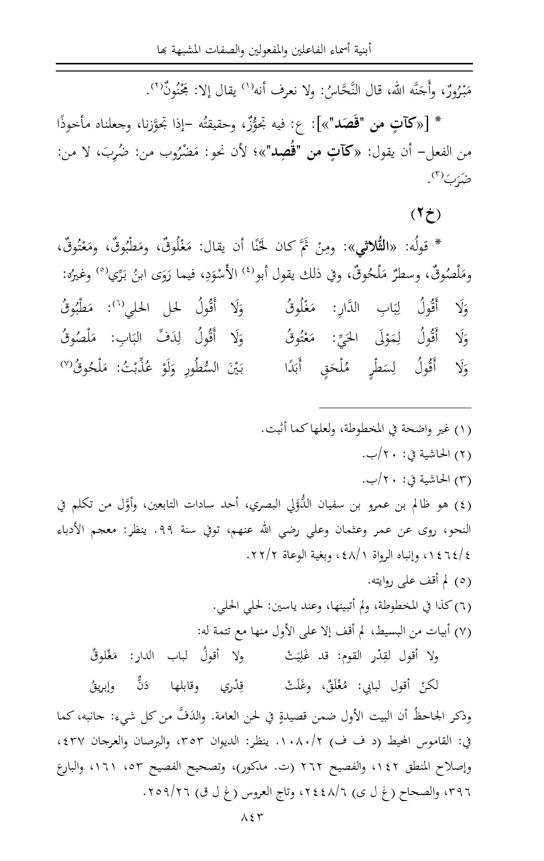 * قولُه: «الثُّلاثي»: ومِنْ ثَمَّ كان لَحْنًا أن يقال: مَغْلُوقٌ، ومَطْبُوقٌ، ومَعْتُوقٌ، ومَلْصُوقٌ، وسطرٌ مَلْحُوقٌ، وفي ذلك يقول أبو (¬٤) الأَسْوَدِ، فيما رَوَى ابنُ بَرِّي (¬٥) وغيرُه: