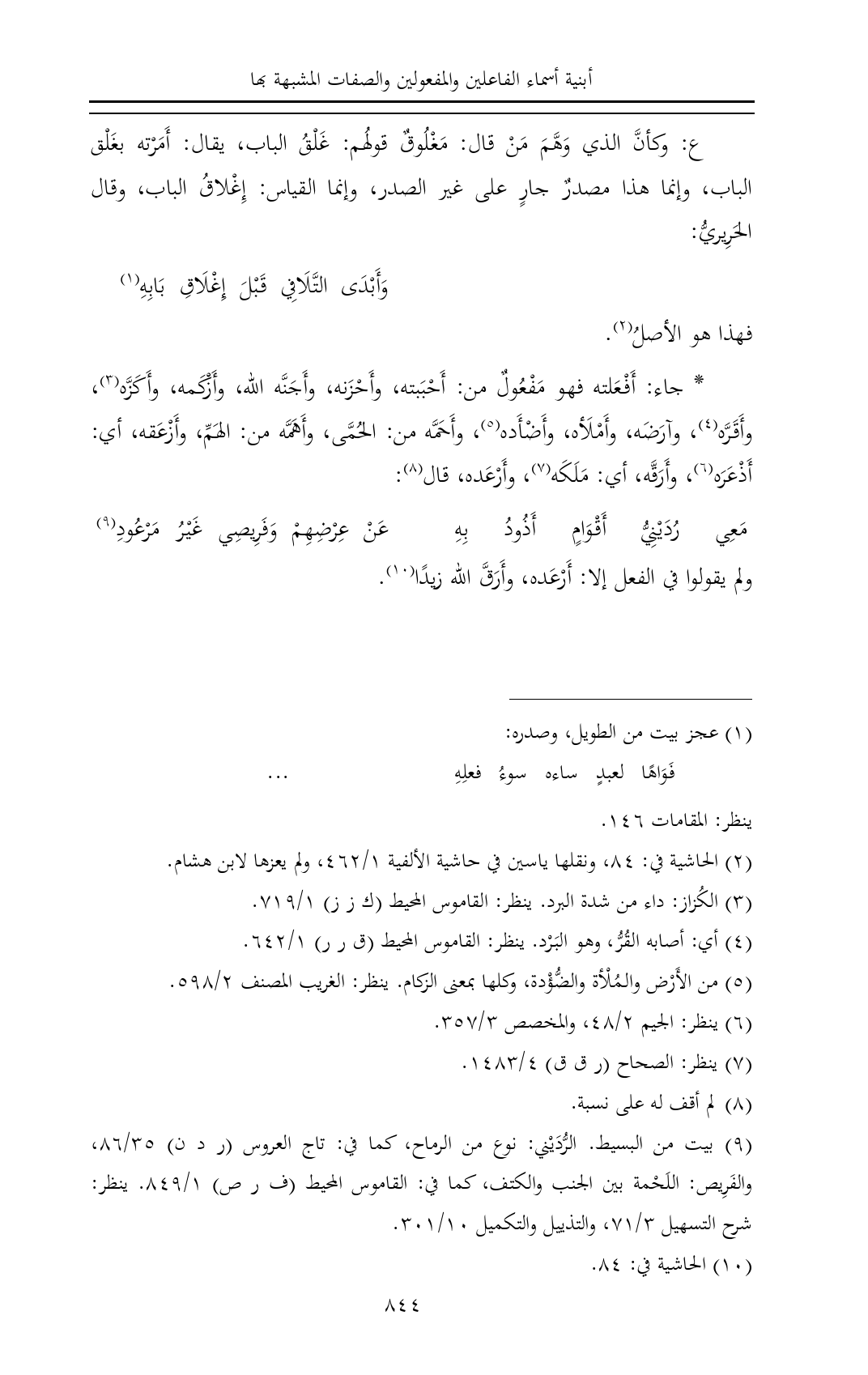 * جاء: أَفْعَلته فهو مَفْعُولٌ من: أَحْبَبته، وأَحْزَنه، وأَجَنَّه الله، وأَزْكَمه، وأَكَزَّه (¬٣)، وأَقَرَّه (¬٤)، وآرَضَه، وأَمْلَأه، وأَضْأَده (¬٥)، وأَحَمَّه من: الحُمَّى، وأَهَمَّه من: الهَمِّ، وأَزْعَقه، أي: أَذْعَرَه (¬٦)، وأَرَقَّه، أي: مَلَكَه (¬٧)، وأَرْعَده، قال (¬٨):
