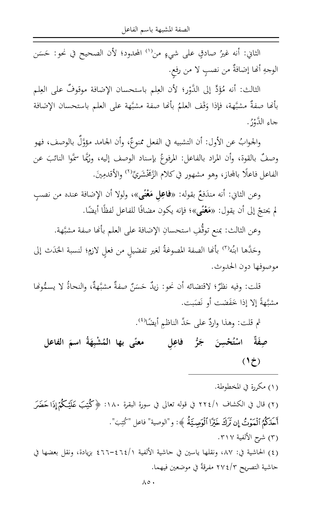 الثالث: أنه مُؤَدٍّ إلى الدَّوْر؛ لأن العِلم باستحسان الإضافة موقوفٌ على العِلم بأنها صفةٌ مشبَّهة، فإذا وَقَف العلمُ بأنها صفة مشبَّهة على العلم باستحسان الإضافة جاء الدَّوْرُ.