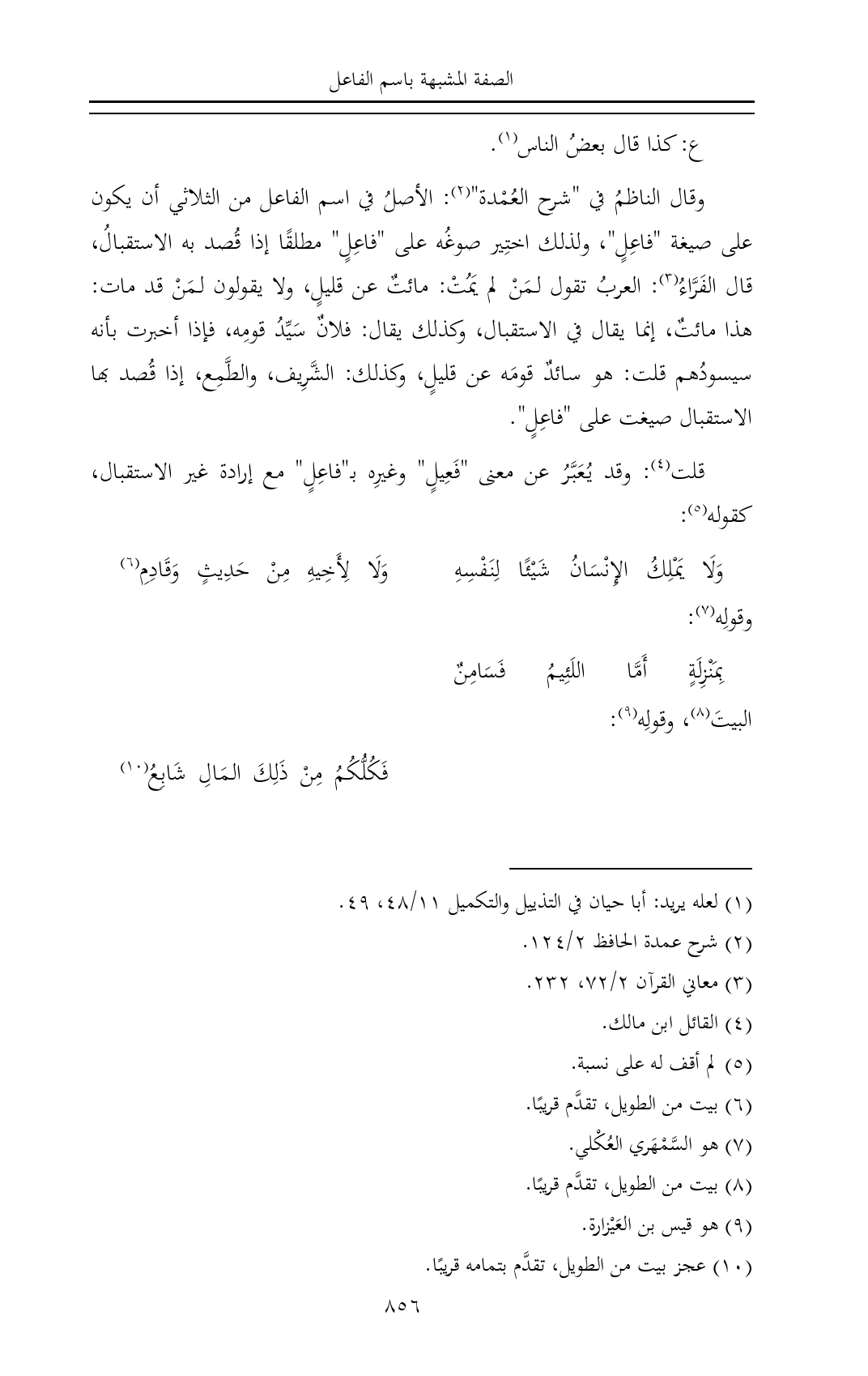 وقال الناظمُ في "شرح العُمْدة" (¬٢): الأصلُ في اسم الفاعل من الثلاثي أن يكون على صيغة "فاعِلٍ"، ولذلك اختِير صوغُه على "فاعِلٍ" مطلقًا إذا قُصد به الاستقبالُ، قال الفَرَّاءُ (¬٣): العربُ تقول لمَنْ لم يَمُتْ: مائتٌ عن قليلٍ، ولا يقولون لمَنْ قد مات: هذا مائتٌ، إنما يقال في الاستقبال، وكذلك يقال: فلانٌ سَيِّدُ قومِه، فإذا أخبرت بأنه سيسودُهم قلت: هو سائدٌ قومَه عن قليلٍ، وكذلك: الشَّرِيف، والطَّمِع، إذا قُصد بها الاستقبال صيغت على "فاعِلٍ".