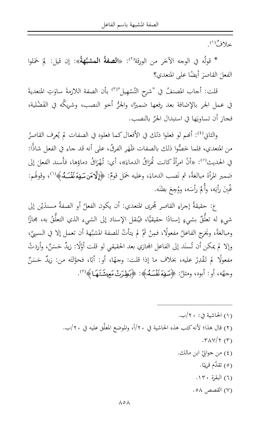 ع: حقيقةُ إجراءِ القاصر مُجرى المتعدي: أن يكون الفعلُ أو الصفةُ مسندَيْن إلى شيءٍ له تعلُّقٌ بشيءٍ إسنادًا حقيقيًّا، فيُنقل الإسناد إلى الشيء الذي التعلُّقُ به، مجازًا ومبالغةً، ويَخرج الفاعلُ مفعولًا، فمِنْ ثَمَّ لم يتأتَّ للصفة المشبَّهة أن تعمل إلا في السببيِّ، وإلا لم يمكن أن تُسنَد إلى الفاعل المجازي بعد الحقيقي لو قلت أوَّلًا: زيدٌ حَسَنٌ، وأردتَّ مفعولًا لم تَقْدِرْ عليه، بخلاف ما إذا قلت: وجهًا، أو: أبًا، فحوَّلتَه من: زيدٌ حَسَنٌ وجهُه، أو: أبوه، ومثلُ: {سَفِهَ نَفْسَهُ}: {بَطِرَتْ مَعِيشَتَهَا} (¬٧).