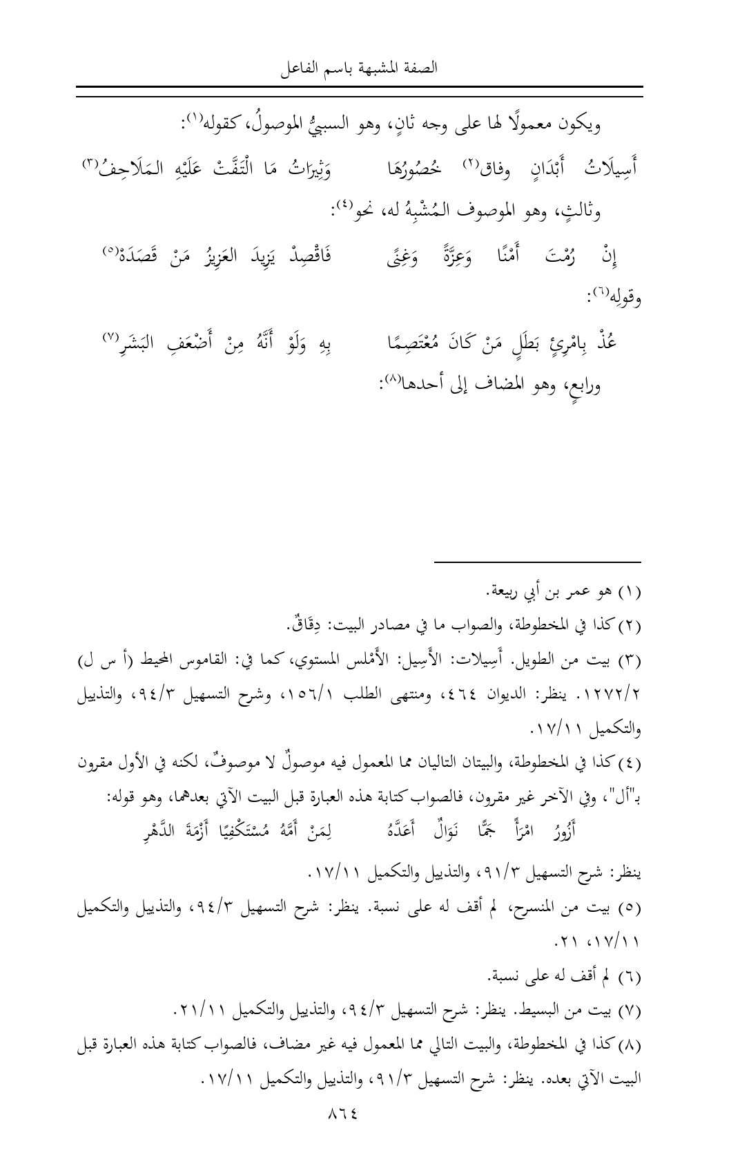 (¬٤) كذا في المخطوطة، والبيتان التاليان مما المعمول فيه موصولٌ لا موصوفٌ، لكنه في الأول مقرون بـ"أل"، وفي الآخر غير مقرون، فالصواب كتابة هذه العبارة قبل البيت الآتي بعدهما، وهو قوله: