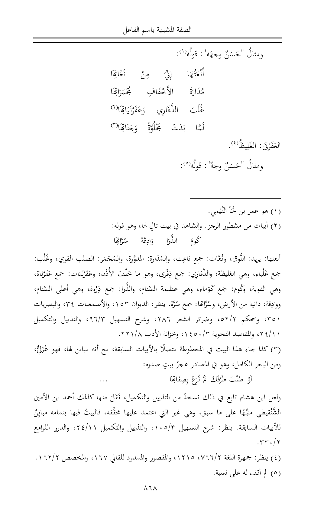 أنعتها: يريد: النُّوق، ونُعَّات: جمع ناعِت، والمُدَارة: المدوَّرة، والمُجْمَر: الصلب القوي، وغُلْب: جمع غَلْباء، وهي الغليظة، والذَّفارِي: جمع ذِفْرى، وهو ما خَلْفَ الأُذُن، وعَفَرْنَيَات: جمع عَفَرْناة، وهي القوية، وكُوم: جمع كَوْماء، وهي عظيمة السَّنام، والذُّرا: جمع ذِرْوة، وهي أعلى السَّنام، ووادِقة: دانية من الأرض، وسُرَّاتها: جمع سُرَّة. ينظر: الديوان ١٥٣، والأصمعيات ٣٤، والبصريات ٣٥١، والمحكم ٢/ ٥٢، وضرائر الشعر ٢٨٦، وشرح التسهيل ٣/ ٩٦، والتذييل والتكميل ١١/ ٢٤، والمقاصد النحوية ٣/ ١٤٥٠، وخزانة الأدب ٨/ ٢٢١.