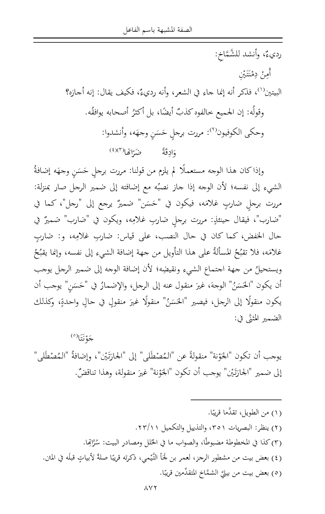 وإذا كان هذا الوجه مستعملًا لم يلزم من قولنا: مررت برجلٍ حَسَنٍ وجهَه إضافةُ الشيء إلى نفسه؛ لأن الوجه إذا جاز نصبُه مع إضافته إلى ضمير الرجل صار بمنزلة: مررت برجلٍ ضاربٍ غلامَه، فيكون في "حَسَن" ضميرٌ يرجع إلى "رجل"، كما في "ضارب"، فيقال حينئذٍ: مررت برجلٍ ضاربِ غلامِه، ويكون في "ضارب" ضميرٌ في حال الخفض، كما كان في حال النصب، على قياس: ضاربِ غلامِه، و: ضاربٍ غلامَه، فلا تقبُحُ المسألةُ على هذا التأويل من جهة إضافة الشيء إلى نفسه، وإنما يقبُحُ ويستحيلُ من جهة اجتماع الشيء ونقيضِه؛ لأن إضافة الوجه إلى ضمير الرجل يوجب أن يكون "الحَسَنُ" الوجهَ، غيرَ منقول عنه إلى الرجل، والإضمارُ في "حَسَنٍ" يوجب أن يكون منقولًا إلى الرجل، فيصير "الحَسَنُ" منقولًا غيرَ منقولٍ في حالٍ واحدةٍ، وكذلك الضمير المثنَّى في: