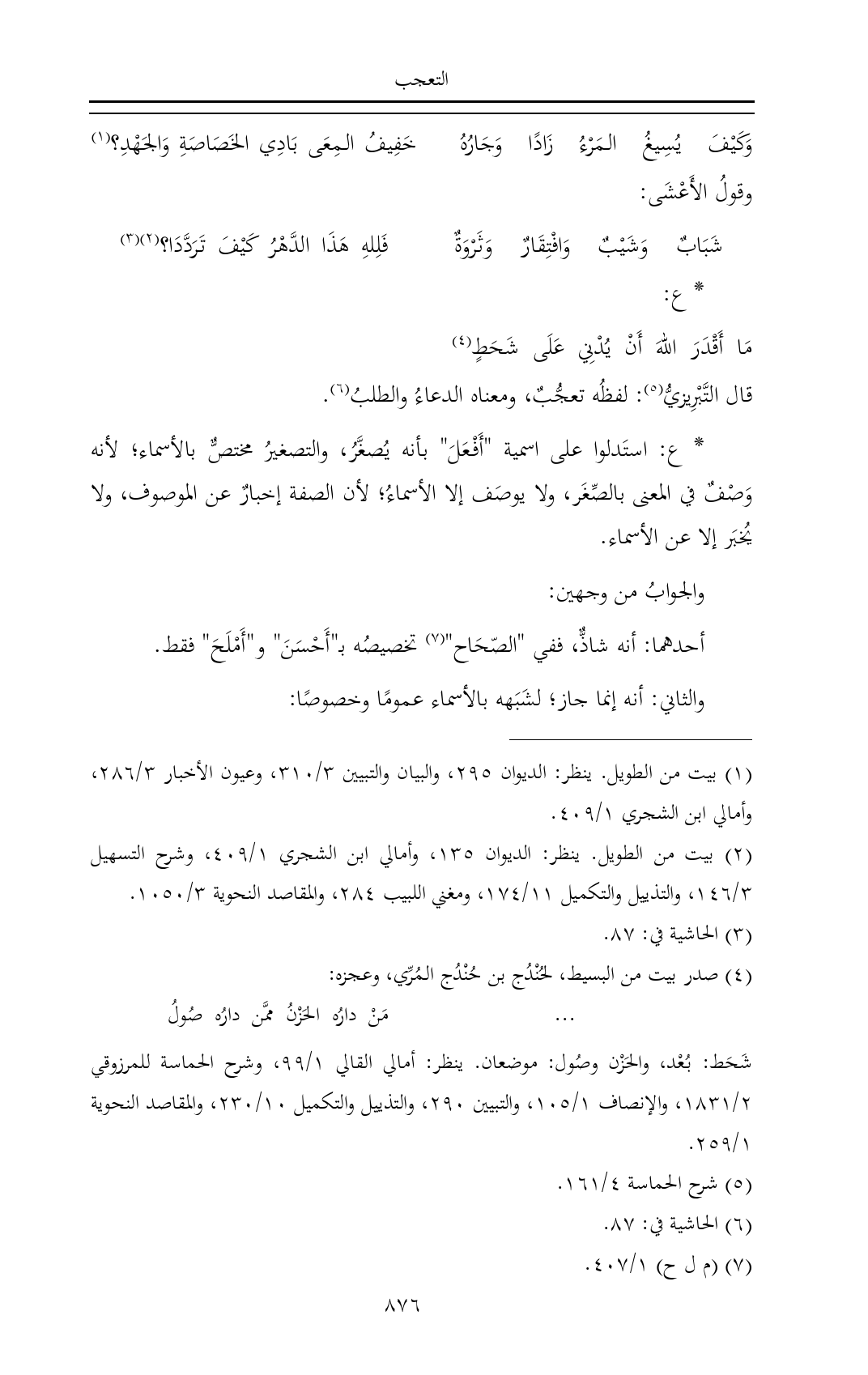 * ع: استَدلوا على اسمية "أَفْعَلَ" بأنه يُصغَّرُ، والتصغيرُ مختصٌّ بالأسماء؛ لأنه وَصْفٌ في المعنى بالصِّغَر، ولا يوصَف إلا الأسماءُ؛ لأن الصفة إخبارٌ عن الموصوف، ولا يُخبَر إلا عن الأسماء.