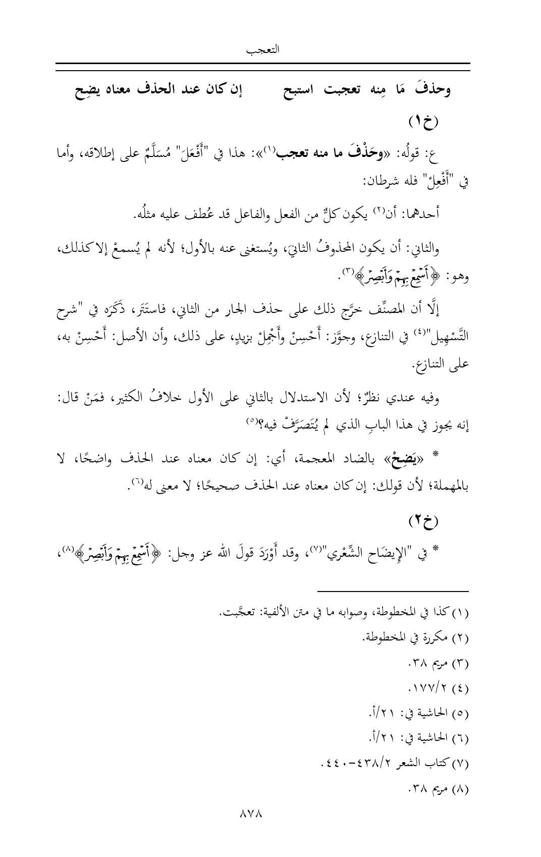 ع: قولُه: «وحَذْفَ ما منه تعجب (¬١)»: هذا في "أَفْعَلَ" مُسَلَّمٌ على إطلاقه، وأما في "أَفْعِلْ" فله شرطان:
