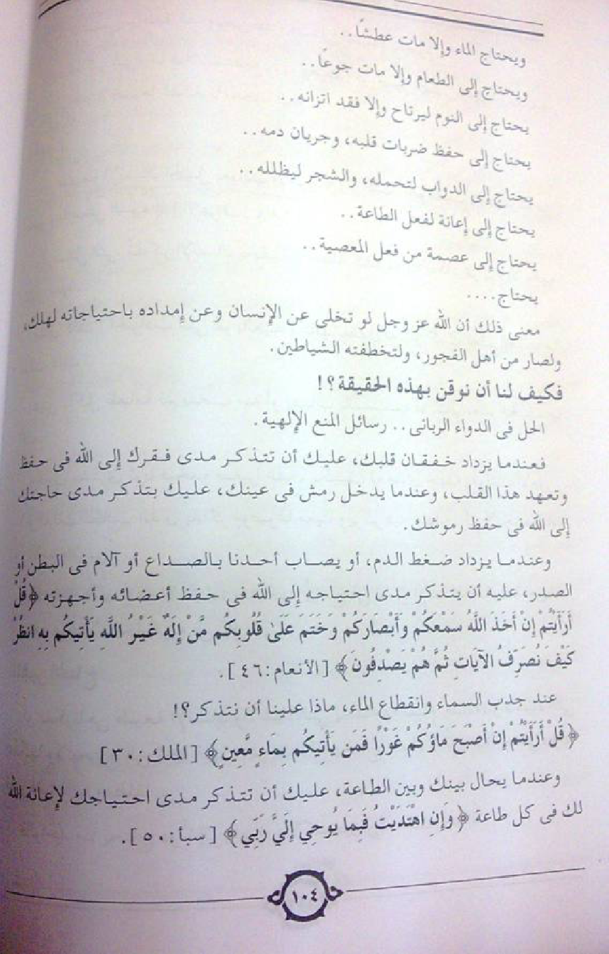 فعندما يزداد خفقان قلبك، عليك أن تتذكر مدى فقرك إلى الله في حفظ وتعهد هذا القلب، وعندما يدخل رمش في عينك، عليك بتذكر مدى حاجتك إلى الله في حفظ رموشك.
