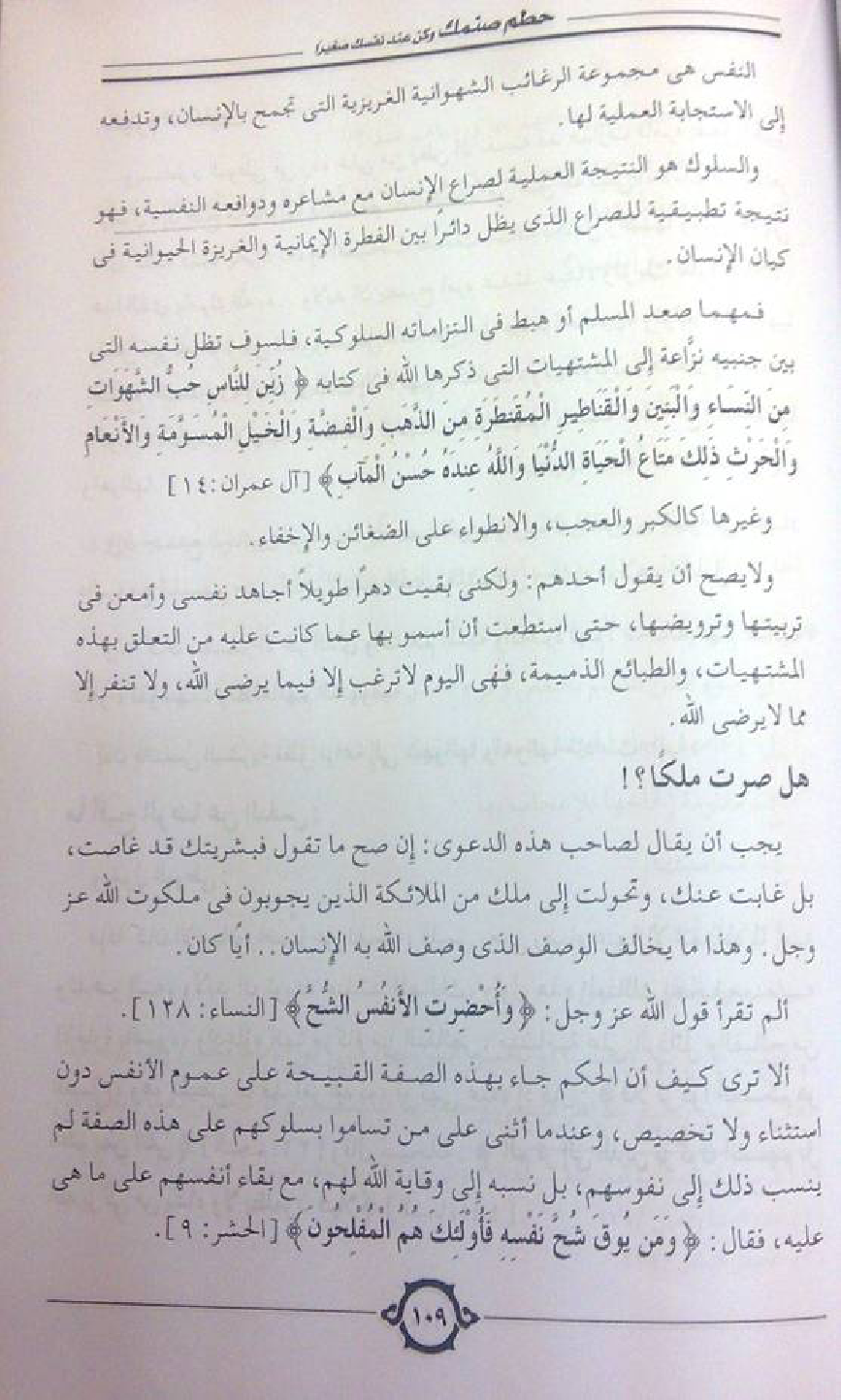 فمهما صعد السلم أو هبط في التزاماته السلوكية، فلسوف تظل نفسه التي بين جنبيه نزاعة إلى المشتهيات التي ذكرها الله في كتابه {زُيِّنَ لِلنَّاسِ حُبُّ الشَّهَوَاتِ مِنَ النِّسَاءِ وَالْبَنِينَ وَالْقَنَاطِيرِ الْمُقَنْطَرَةِ مِنَ الذَّهَبِ وَالْفِضَّةِ وَالْخَيْلِ الْمُسَوَّمَةِ وَالْأَنْعَامِ وَالْحَرْثِ ذَلِكَ مَتَاعُ الْحَيَاةِ الدُّنْيَا وَاللَّهُ عِنْدَهُ حُسْنُ الْمَآبِ} [آل عمران: 14].