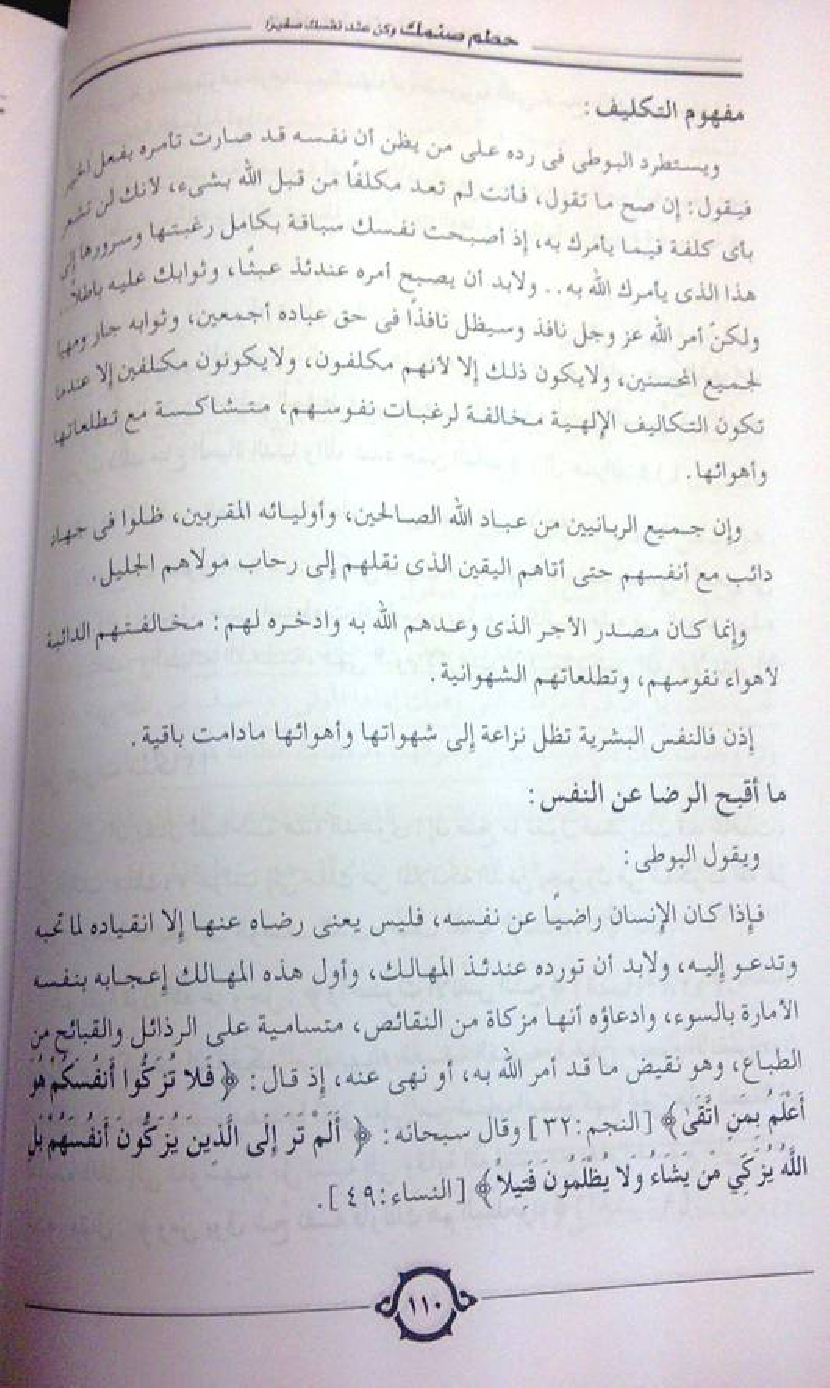 ويستطرد البوطي في رده على من يظن أن نفسه قد صارت تأمره بفعل الخير فيقول: إن صح ما تقول، فأنت لم تعد مكلفًا من قبل الله بشيء، لأنك لن تشعر بأي كلفة فيما يأمرك به، إذ أصبحت نفسك سباقة بكامل رغبتها وسرورها إلى هذا الذي يأمرك الله به .. ولابد أن يصبح أمره عندئذ عبثًا، وثوابك عليه باطلًا .. ولكن أمر الله عز وجل نافذ وسيظل نافذًا في حق عباده أجمعين، وثوابه جار ومهيأ لجميع المحسنين، ولا يكون ذلك إلا لأنهم مكلفون، ولايكونون مكلفين إلا عندما تكون التكاليف الإلهية مخالفة لرغبات نفوسهم، متشاكسة مع تطلعاتها وأهوائها.
