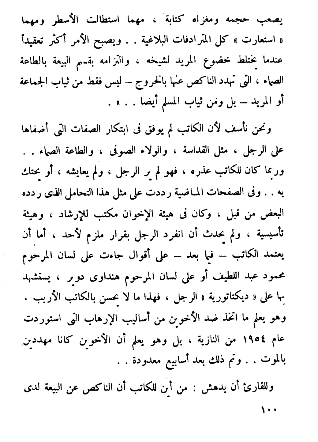 ونحن نأسف لأن الكاتب لم يوفق في ابتكار الصفات التي أضفاها على الرجل مثل القداسة والولاء الصوفي والطاعة الصماء. وربما كان للكاتب عذره فهو لم ير الرجل ولم يعايشه أو يحتك به .. وفي الصفحات الماضية رَدَدْتُ على مثل هذا التحامل الذي رَدَّدَهُ البعض من قبل وكان في هيئة الإخوان مكتب للإرشاد، وهيئة تأسيسية، ولم يحدث الرجل بقرار ملزم لأحد، أما أن يعتمد الكاتب - فيما بعد - على أقوال جاءت على لسان المرحوم محمود عبد اللطيف أو على لسان المرحوم هنداوي دوير , يستشهد بها على «ديكتاتورية» الرجل فهذا ما لا يحسن بالكاتب الأريب، وهو يعلم ما اتخذ ضد الأخوين من أساليب الإرهاب التي استوردت عام 1954 من النازية بل وهو يعلم أن الأخوين كَانَا مُهَدَّدَيْنِ بِالمَوْتِ .. وتم ذلك بعد أسابيع معدودة ..