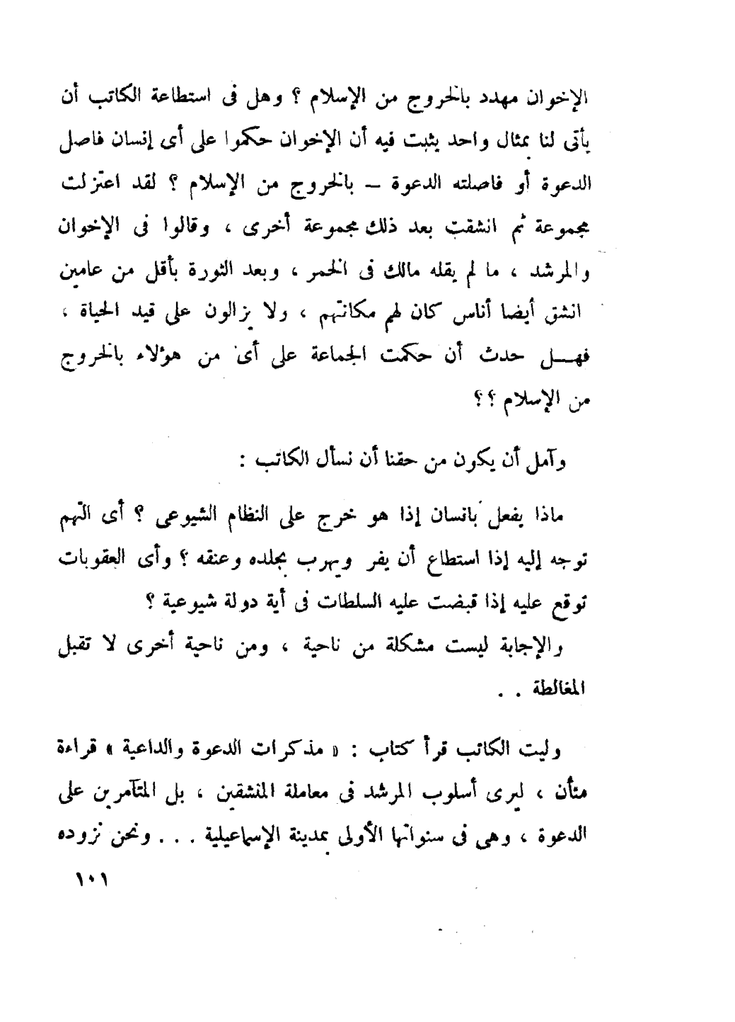 وليت الكاتب قرأ كتاب:" مذكرات الدعوة والداعية " قراءة مُتَأَنٍّ ليرى أسلوب المرشد في معاملة المنشقين بل المتآمرين على الدعوة وهي في سنواتها الأولى بمدينة الإسماعيلية ... ونحن نزوده