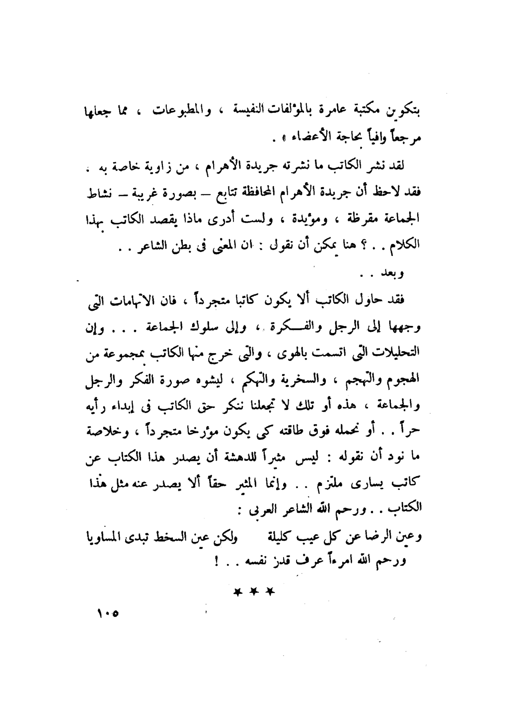 لقد نشر الكاتب ما نشرته جريدة " الأهرام " من زاوية خاصة به فقد لاحظ أن جريدة " الأهرام " المحافظة تتابع - بصورة غريبة - نشاط الجماعة مقرظة، ومؤيدة، ولست أدري ماذا يقصد الكاتب بهذا الكلام .. ؟ هنا يمكن أن نقول: إن المعنى في بطن الشاعر ..