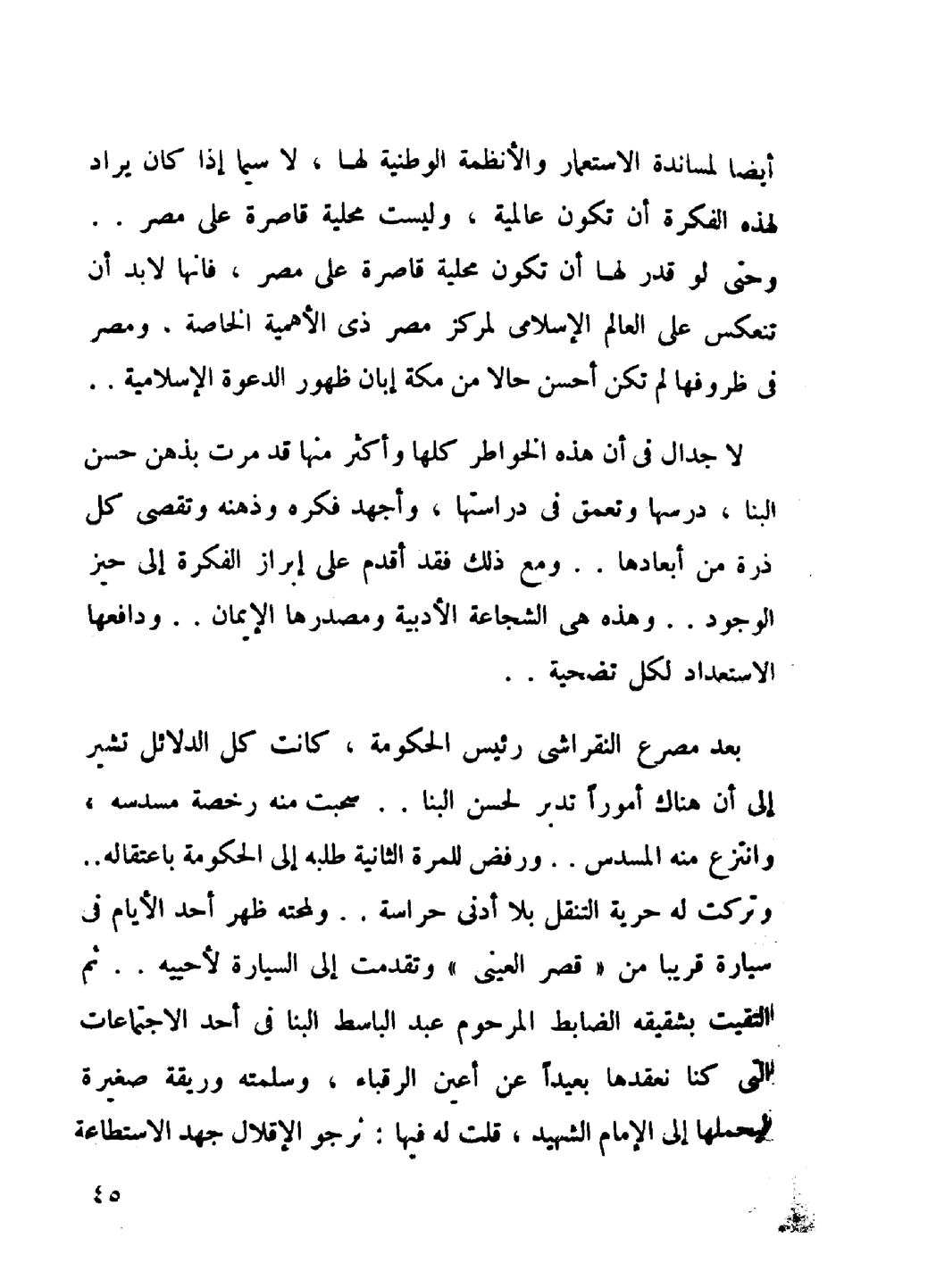 لا جدال في أن هذه الخواطر كلها وأكثر منها قد مرت بذهن حسن البنا، درسها وتعمق في دراستها، وأجهد فكره وذهنه وتقصى كل ذرة من أبعادها. ومع ذلك فقد أقدم على إبراز الفكرة إلى حيز الوجود، وهذه هي الشجاعة الأدبية ومصدرها الإيمان، ودافعها الاستعداد لكل تضحية.