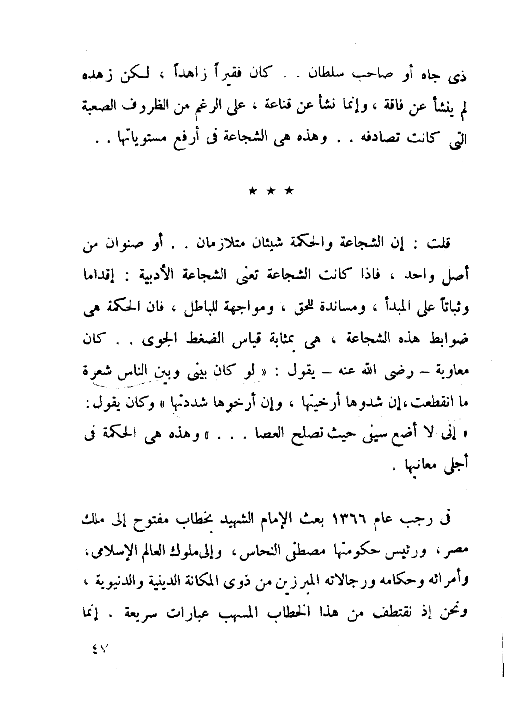 في رجب عام 1366 بعث الإمام الشهيد بخطاب مفتوح إلى ملك مصر، ورئيس حكومتها مصطفى النحاس، إلى ملوك العالم الإسلامي، وأمرائه وحكامه ورجالاته المبرزين من ذوي المكانة الدينية والدنيوية، ونحن إذ نقتطف من هذا الخطاب المسهب عبارات سريعة، إنما