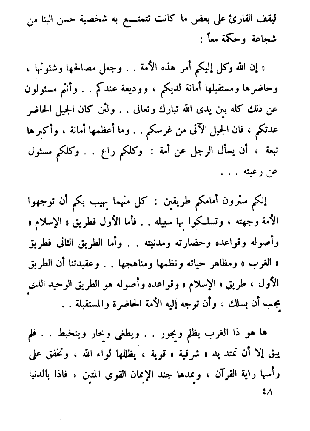 «إِنَّ اللهَ وَكَّلَ إِلَيْكُمْ أَمْرَ هَذِهِ الأُمَّةِ، وَجَعَلَ مَصَالِحَهَا وَشُؤُونَهَا، وَحَاضِرَهَا وَمُسْتَقْبَلَهَا أَمَانَةً لَدَيْكُمْ، وَوَدِيعَةً عِنْدَكُمْ، وَأَنْتُمْ مَسْؤُولُونَ عَنْ ذَلِكَ كُلِّهِ بَيْنَ يَدَيْ اللهِ تَبَارَكَ وَتَعَالَى، وَلَئِنْ كَانَ الجِيلُ الحاضِرُ عِدَّتَكُمْ، فَإِنَّ الجِيلَ الآتي مِنْ غِرْسِكُمْ، وَمَا أَعْظَمَهَا أَمَانَةً، وَأَكْبَرَهَا تَبِعَةً أَنْ يُسْأَلَ الرَّجُلُ عَنْ أُمَّةٍ: وَكُلُّكُمْ رَاعٍ .. وَكُلُّكُمْ مَسْؤُولٌ عَنْ رَعِيَّتِهِ ... إِنَّكُمْ سَتَرَوْنَ أَمَامَكُمْ طَرِيقَيْنِ: كُلٌّ مِنْهُمَا يَهِيبُ بِكُمْ أَنْ تُوَجِّهُوا الأُمَّةَ وِجْهَتَهُ، وَتَسْلُكُوا بِهَا سَبِيلَهُ، فَأَمَّا الأَوَّلُ فَطَرِيقُ " الإِسْلاَمِ " وَأُصُولَهُ وَقَوَاعِدَهُ وَحَضَارَتَهُ وَمَدَنِيَّتَهُ، وَأَمَّا الطَّرِيقُ الثَّانِي فَطَرِيقُ " الغَرْبِ " وَمَظَاهِرَ حَيَاتِهِ وَنَظْمِهَا وَمَنَاهِجِهَا، وَعَقِيدَتُنَا أَنَّ الطَّرِيقَ الأَوَّلَ، طَرِيقُ " الإِسْلاَمِ " وَقَوَاعِدَهُ وَأُصُولَهُ هُوَ الطَّرِيقُ الوَحِيدُ الذِي يَجِبُ أَنْ يَسْلُكَ، وَأَنْ تُوَجُّهَ إِلَيْهِ الأُمَّةُ الحَاضِرَةُ وَالمُسْتَقْبِلَةُ ... هَا هُوَ الغَرْبُ يَظْلِمُ وَيَجُورُ، وَيَطْغَى وَيُحَارُ وَيَتَخَبَّطُ، فَلَمْ يَبْقَ إلاَّ أَنْ تَمْتَدَّ يَدٌ " شَرْقِيَّةٌ " قَوِيَّةٌ، يُظَلِّلُهَا لِوَاءُ اللهِ، وَتَخْفِقُ عَلَى رَأَّسِهَا رَايَةُ القُرْآنِ، وَيُمِدُّهَا جُنْدُ الإِيمَانِ القَوِيُّ المَتِينُ، فَإذَا بِالدُّنْيَا