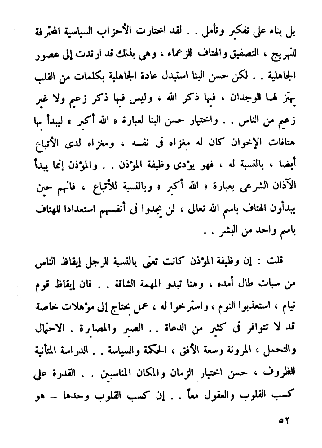 قلتُ: إن وظيفة المؤذن كانت تعني بالنسبة للرجل إيقاظ الناس من سبات طال أمده، وهنا تبدو المهمة الشاقة، فإن إيقاظ قوم نيام، استعذبوا النوم، واسترخوا له، عمل يحتاج إلى مؤهلات خاصة قد لا تتوافر في كثير من الدعاة، الصبر والمصابرة، الاحتمال والتحمل، المرونة وسعة الأفق، الحكمة والسياسة، الدراسة المتأنية للظروف، حسن اختيار الزمان والمكان الناسبين، القدرة على كسب القلوب والعقول معًا. إن كسب القلوب وحدها هو