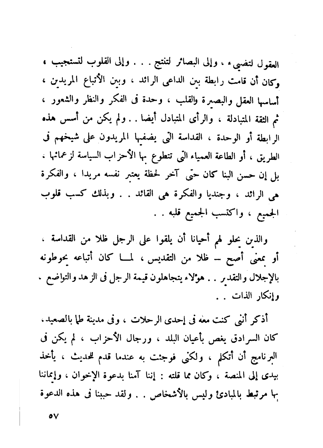 العقول لتضيء، وإلى البصائر لتنتج، وإلى القلوب لتستجيب، وكان أن قامت رابطة بين الداعي الرائد، وبين الأتباع المريدين، أساسها العقل والبصيرة والقلب، وحدة في الفكر والنظر والشعور، ثم الثقة المتبادلة، والرأي المتبادل أيضًا، ولم يكن من أسس هذه الرابطة أو الوحدة، القداسة التي يضفيها المريدون على شيخهم في الطريق، أو الطاعة العمياء التي تتطوع بها الأحزاب السياسية لزعمائها، بل إن حسن البنا كان حتى آخر لحظة يعتبر نفسه مريدًا، والفكرة هي الرائد، وجنديًا والفكرة هي القائد. وبذلك كسب قلوب الجميع، واكتسب الجميع قلبه.