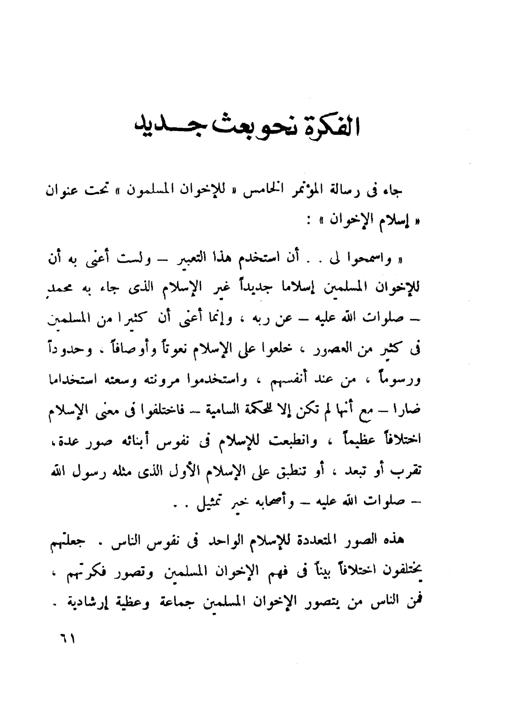 «وَاسْمَحُوا لِي أَنْ أَسْتَخْدِمَ هَذَا التَّعْبِيرَ وَلَسْتُ أَعَنِي بِهِ أَنْ لِلإِخْوَانِ المُسْلِمِينَ إِسْلاَمًا جَدِيدًا غَيْرَ الإِسْلاَمِ الذِي جَاءَ بِهِ مُحَمَّدٌ - صَلَوَاتُ اللهِ عَلَيْهِ - عَنْ رَبِّهِ وَإِنَّمَا أَعَنِي أَنْ كَثِيرًا مِنْ المُسْلِمِينَ فِي كَثِيرٍ مِنَ العُصُورِ خَلَعُوا عَلَى الإِسْلاَمِ نُعُوتًا وَأَوْصَافًا وَحُدُودًا وَرُسُومًا مِنْ عِنْدِ أَنْفُسِهِمْ وَاسْتَخْدَمُوا مُرُونَتَهُ وَسَعَتِهِ اِسْتِخْدامًا ضَارًّا مَعَ أَنَّهَا لَمْ تَكُنْ إلاَّ لِلْحِكْمَةِ السَّامِيَةِ فَاخْتَلَفُوا فِي مَعْنَى الإِسْلاَمِ اِخْتِلاَفًا عَظِيمًا , وَانْطَبَعَتْ لِلإِسْلاَمِ فِي نُفُوسِ أَبْنَائِهِ صُوَرٌ عِدَّةٌ تُقَرِّبُ أَوْ تُبْعِدُ، أَوْ تَنْطَبِقُ عَلَى الإِسْلاَمِ الأَوَّلِ الذِي مَثَّلَهُ رَسُولُ اللهِ - صَلَوَاتُ اللهِ عَلَيْهِ - وَأَصْحَابُهُ خَيْرَ تَمْثِيلِ ..