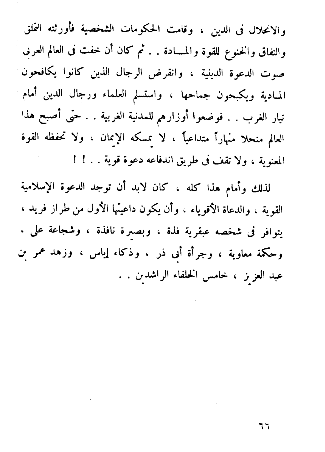 والانحلال في الدين، وقامت الحكومات الشخصية فأورثته التملق والنفاق والخنوع للقوة والمادة، ثم كان أن خفت في العالم العربي صوت الدعوة الدينية , وانقرض الرجال الذين كانوا يكافحون المادية ويكبحون جماحها، واستسلم العلماء ورجال الدين أمام تيار الغرب ... فوضعوا أوزارهم للمدنية الغربية .. حتى أصبح هذا العالم منحلاً منهارًا متداعيًا، لا يمسكه الإيمان، ولا تحفظه القوة المعنوية ولا تقف في طريق اندفاعه دعوة قوية .. !!