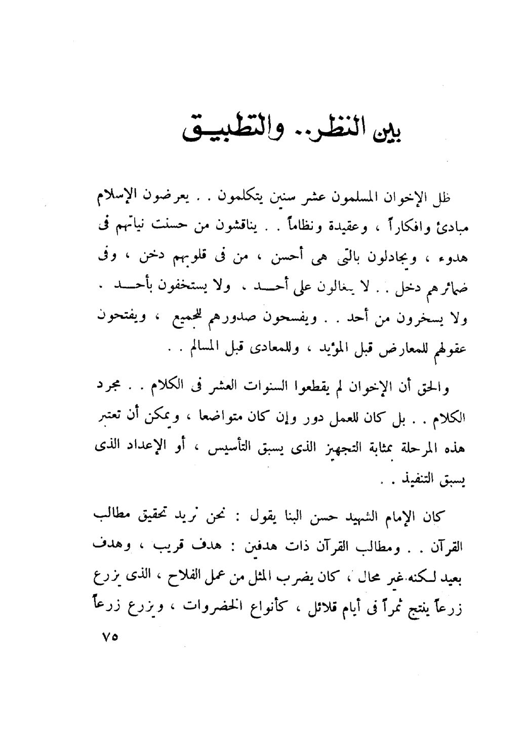 ظل الإخوان المسلمون عشر سنين يتكلمون، يعرضون الإسلام مبادئ وأفكارًا , وعقيدة ونظامًا .. يناقشون من حسنت نياتهم في هدوء , ويجادلون بالتي هي أحسن , من في قلوبهم دخن , وفي ضمائرهم دخل، لا يتعالون على أحد , ولا يستخفون بأحد ولا يسخرون من أحد، ويفسحون صدورهم للجميع , ويفتحون عقولهم للمعارض قبل المؤيد وللمعادي قبل المسالم ..