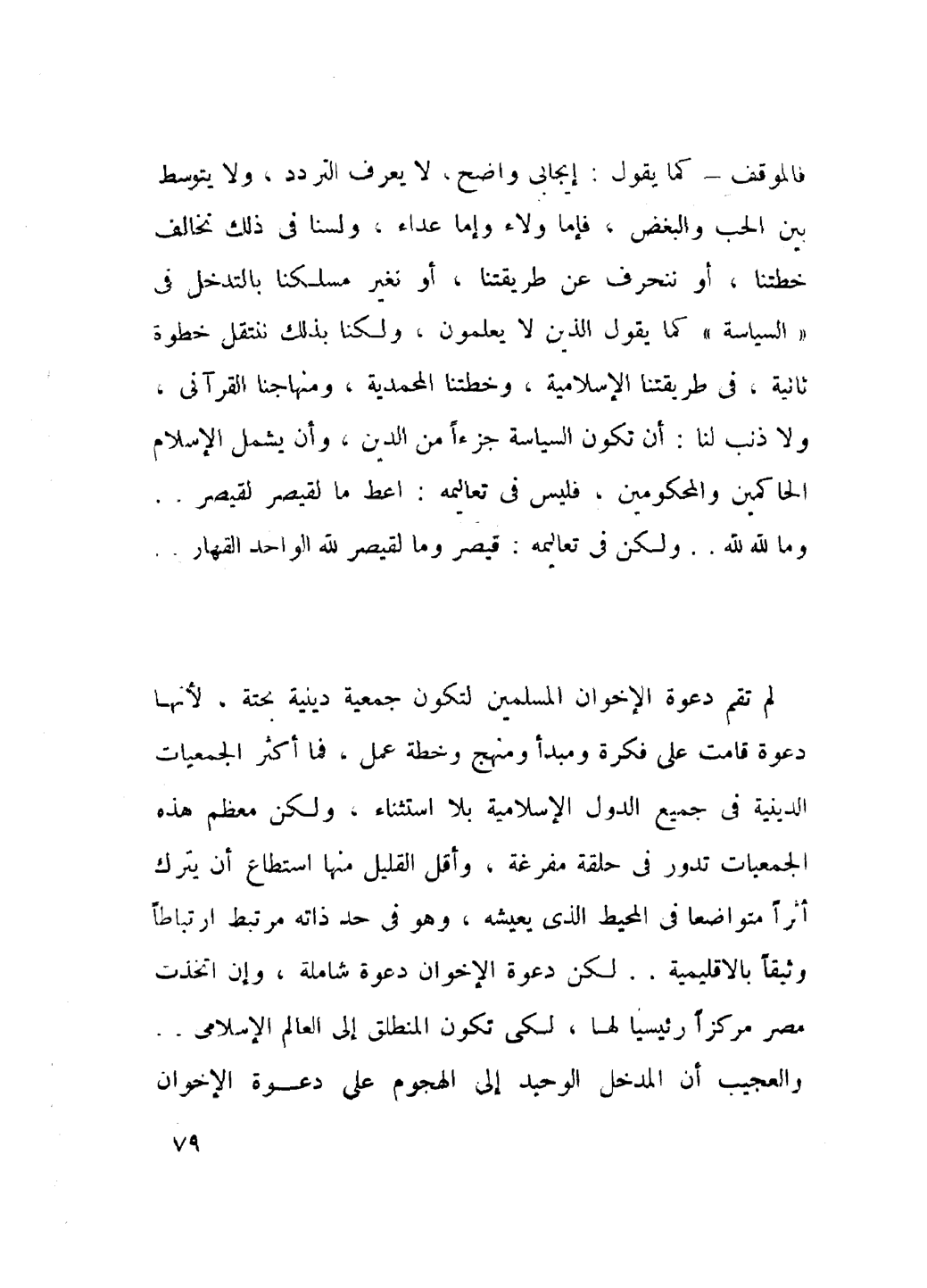 فالموقف - كما يقول: إيجابي واضح لا يعرف التردد, ولا يتوسط بين الحب والبغض فإما ولاء وإما عداء , ولسنا في ذلك نخالف خطتنا أو ننحرف عن طريقتنا أو نغير مسلكنا بالتدخل في «السياسة» كما يقول الذين لا يعلمون ولكنا بذلك ننتقل خطوة ثانية في طريقتنا الإسلامية وخطتنا المحمدية ومنهاجنا القرآني ولا ذنب لنا أن تكون السياسة جزءًا من الدين وأن يشمل الإسلام الحاكمين والمحكومين فليس في تعاليمه أعط ما لقيصر لقيصر .. وما لله لله .. ولكن في تعاليمه: قيصر وما لقيصر لله الواحد القهار ..