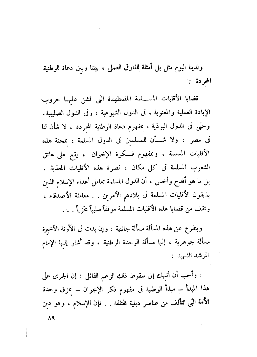 «وأحب أن أنبهك إلى سقوط ذلك الزعم القائل: إن الجري على هذا المبدأ - مبدأ الوطنية في مفهوم فكر الإخوان - يمزق وحده الأمة التي تتألف من عناصر دينية مختلفة .. فإن الإسلام , وهو دين