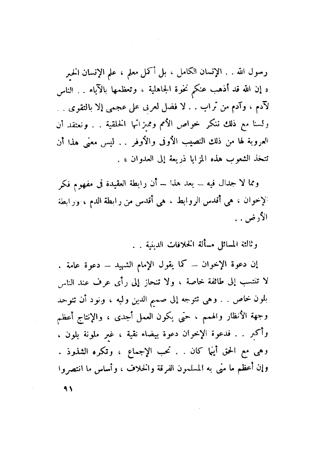 رسول الله .. الإنسان الكامل، بل أكمل معلم علم الإنسان الخير: " إِنَّ اللَّهَ قَدْ أَذْهَبَ عَنْكُمْ نَخْوَةَ الجَاهِلِيَّةِ، وَتَعَظُّمَهَا بالآبَاءِ .. النَّاسُ لآدَمَ، وَآدَمُ مِنْ تُرَابٍ .. لاَ فَضْلَ لِعَرَبِيٍّ عَلَى عَجَمِيٍّ إِلاَّ بِالتَّقْوَى " .. ولسنا مع ذلك ننكر خواص الأمم ومميزاتها الخلقية .. ونعتقد أن العروبة لها من ذلك النصيب الأوفى والأوفر .. ليس معنى هذا أن تتخذ الشعوب هذه المزايا ذريعة إلى العدوان».