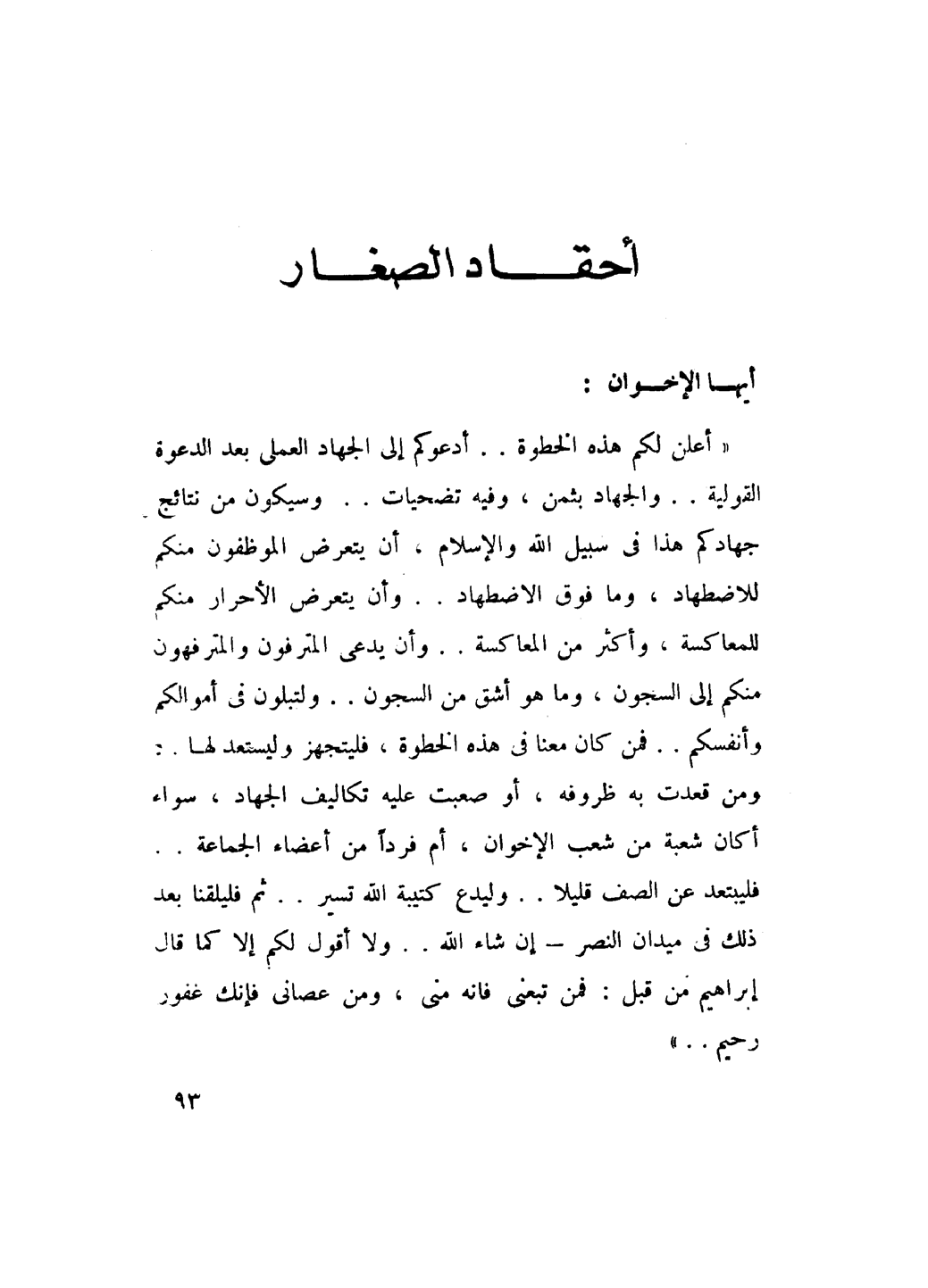 «أعلن لكم هذه الخطوة .. أدعوكم إلى الجهاد العملي بعد الدعوة القولية ... والجهاد بثمن , وفيه تضحيات ... وسيكون من نتائج جهادكم هذا في سبيل الله والإسلام , أن يتعرض الموظفون منكم للاضطهاد, وما فوق الاضطهاد .. وأن يتعرض الأحرار منكم للمعاكسة وأكثر من المعاكسة .. وأن يدعى المترفون والمترفهون منكم إلى السجون , وما هو أشق من السجن .. ولتبلون في أموالكم وأنفسكم .. فمن كان معنا في هذه الخطوة فليتجهز وليستعد لها ومن قعدت به ظروفه أو صعب عليه تكاليف الجهاد سواء أكان شعبة من شعب الإخوان , أم فَرْدًا من أعضاء الجماعة .. فليبتعد عن الصف قليلاً .. وليدع كتيبة الله تسير .. ثم فليلقنا بعد ذلك في ميدان النصر - إن شاء الله .. ولا أقول لكم إلا كما قال إبراهيم من قبل: {فَمَنْ تَبِعَنِي فَإِنَّهُ مِنِّي وَمَنْ عَصَانِي فَإِنَّكَ غَفُورٌ رَحِيمٌ} [إبراهيم: 36] .. ».
