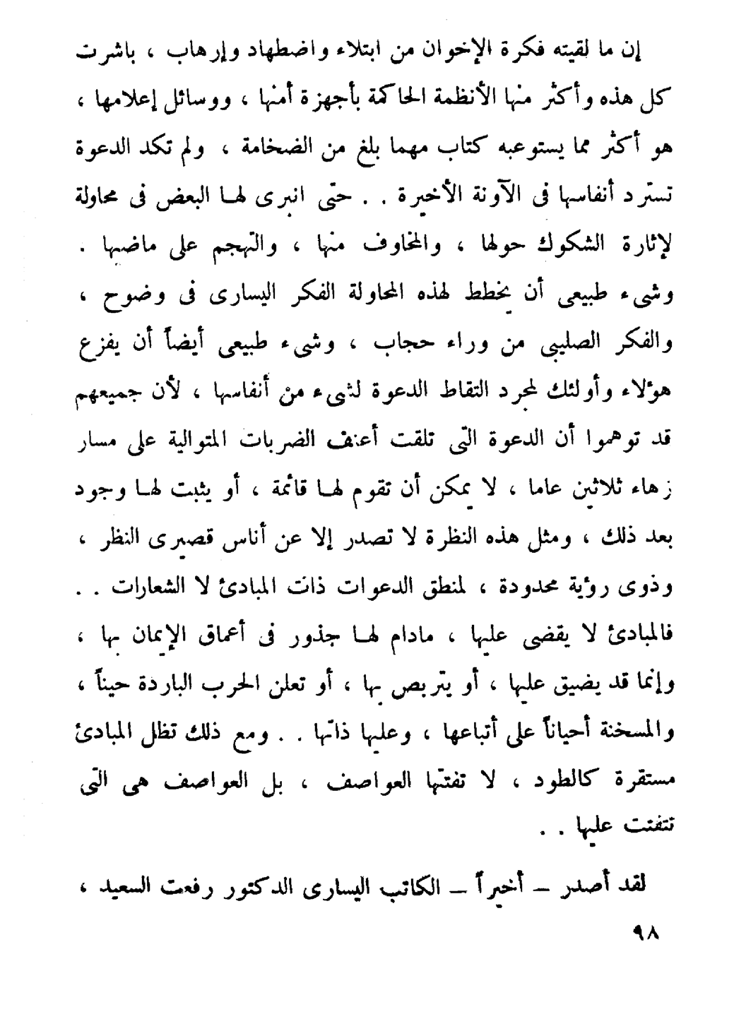 إن ما لقيته فكرة الإخوان من ابتلاء واضطهاد وإرهاب , باشرت كل هذه وأكثر منها الأنظمة الحاكمة بأجهزة أمنها ووسائل إعلامها هو أكثر مما يستوعبه كتاب مهما بلغ من الضخامة لم تكد الدعوة تسترد أنفاسها في الآونة الأخيرة .. حتى انبرى لها البعض في محاولة لإثارة الشكوك حولها , والمخاوف منها والتهجم على ماضيها وشيء طبيعي أن يخطط لهذه المحاولة الفكر اليساري في وضوح والفكر الصليبي من وراء حجاب وشيء طبيعي أيضًا أن يفزع هؤلاء وأولئك من وراء حجاب وشيء طبيعي أيضًا أن يفزع هؤلاء وأولئك لمجرد التقاط الدعوة لشيء من أنفساها لأن جميعهم قد توهموا أن الدعوة التي تلقت أعنف الضربات المتوالية على مسار زهاء ثلاثين عَامًا لا يمكن أن تقوم لها قائمة أو يثبت لها وجود بعد ذلك ومثل هذه النظرة لا تصدر إلا عن أناس قصيري النظر وذوي رؤية محدودة لمنطق الدعوات ذات المبادئ لا الشعارات .. فالمبادئ لا يقضي عليها ما دام لها جذور في أعماق الإيمان بها وإنما قد يضيق عليها , أو يتربص بها , أو تعلن الحرب الباردة حِينًا والمسخنة أحيانًا على أتباعها وعليها ذاتها ... ومع ذلك تظل المبادئ مستقرة كالطود لا تفتها العواصف بل العواصف هي التي تتفتت عليها.