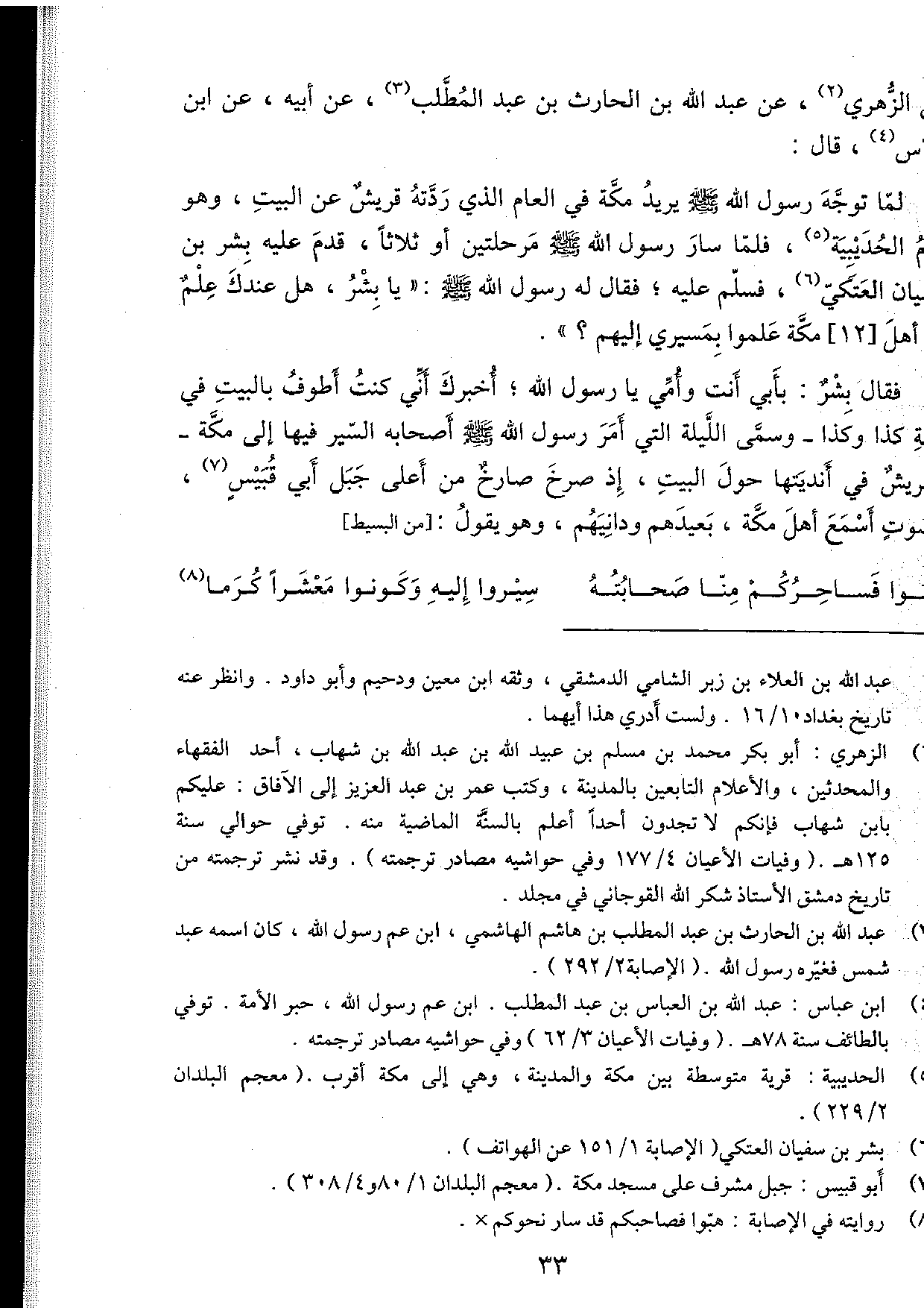 عن الزهري، عن عبد الله بن الحارث بن عبد المطّلب، عن أبيه، عن ابن عباس، قال: لمّا توجَّه رسول الله صلّى الله عليه وسلّم يريد مكة في العام الذي رَدَّته قريش عن البيت، وهو عام الحديْبِيَة، فلما سار رسول الله صلّى الله عليه وسلّم مرحلتين أو ثلاثاً، قدم عليه بشر بن سفيان العتكي، فسلّم عليه. فقال له رسول الله صلّى الله عليه وسلم: يا بشر هل عندك علمٌ أنّ أهل مكة علموا بمسيري إليهم؟ فقال بشر: بأبي أنت وأمي يا رسول الله؛ أخبرك أني كنت أطوف بالبيت في ليلة كذا وكذا "وسمَّى الليلة التي أمر بها رسول الله صلّى الله عليه وسلّم أصحابه بالسَّير فيها إلى مكة" وقريش في أنديتها حول البيت، إذا صرخ صارخٌ من أعلى جبل أبي قُبيس، بصوت أسمع أهل مكة بعيدهم وداينهم، وهو يقول "من البسيط":