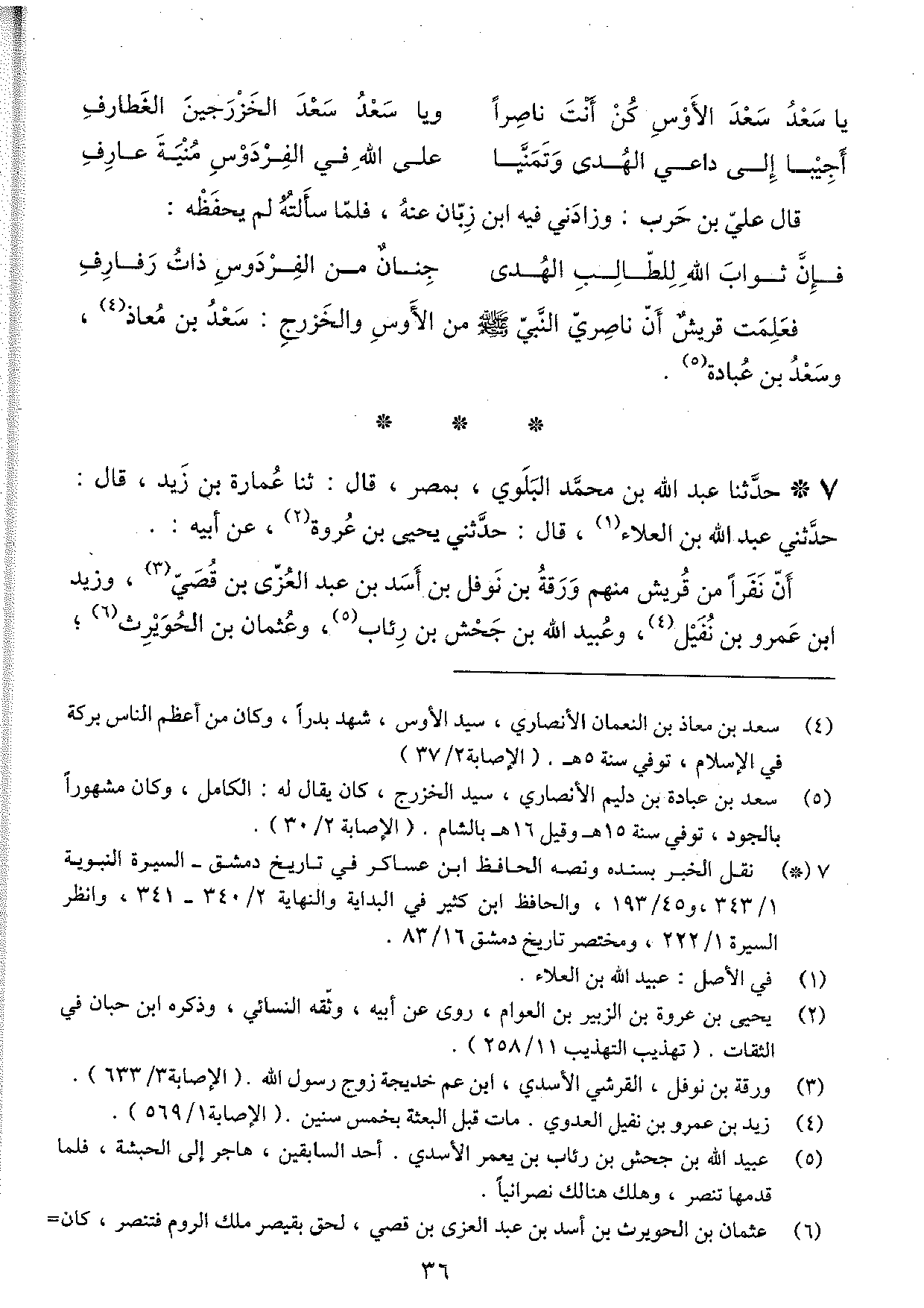 حدثنا عبد الله بن محمد البلويّ، بمصر، قال: ثنا عُمارة بن زيد، قال: حدثني عبد الله بن العلاء، قال: حدثني يحيى بن عروة، عن أبيه: أنّ نفراً من قريش منهم ورقة بن نوفل بن أسد بن عبد العزّى بن قُصيّ، وزيد بن عمرو بن نُفيل، وعبيد الله بن جحش بن رئاب، وعثمان بن الحويرث؛
