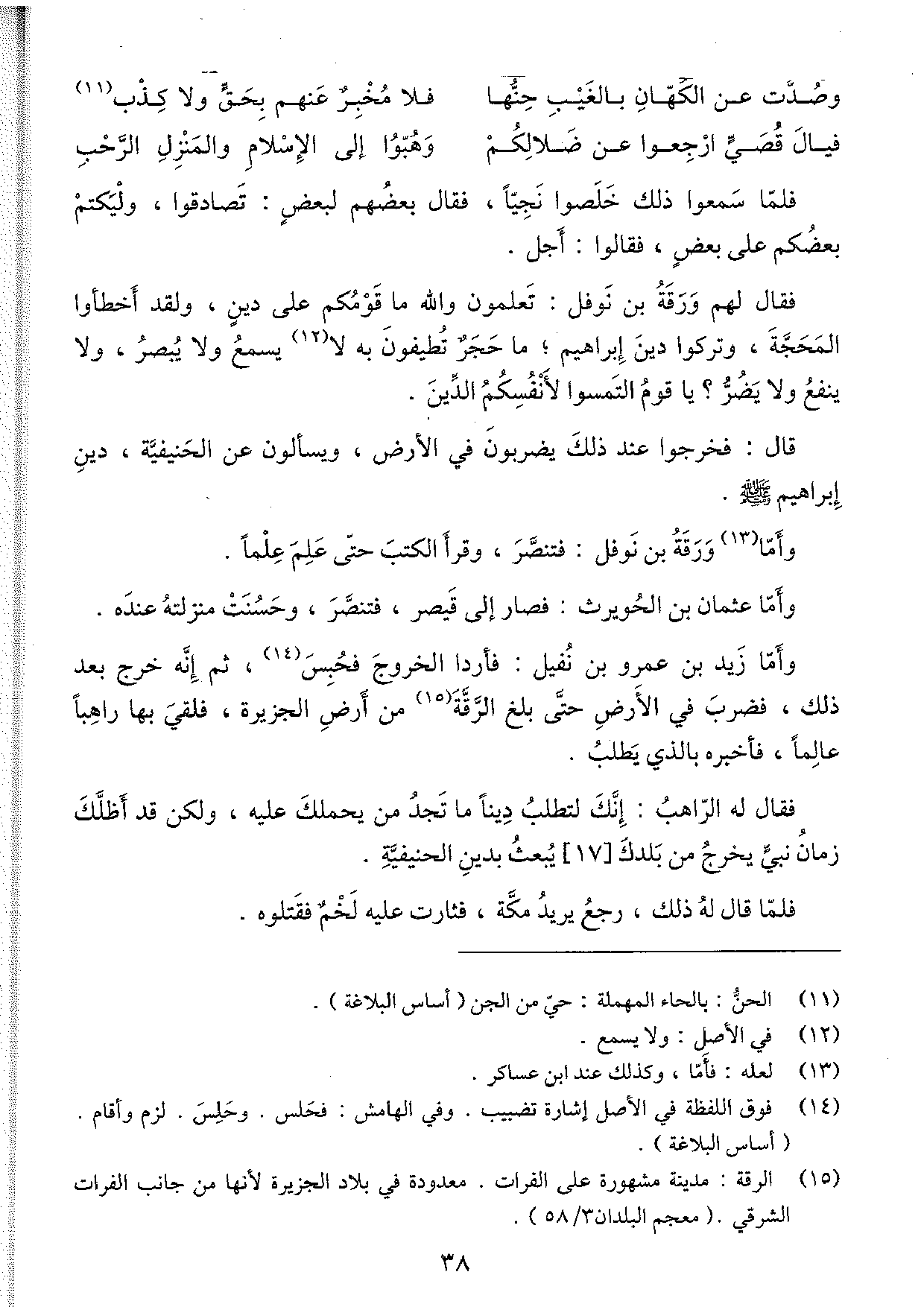 فقال لهم ورقةُ بن نوفل: تعلمون والله ما قومكم على دين، ولقد أخطأوا المَحَجَّةَ، وتكوا دين إبراهيم؛ ما حجر تطيفون به لا يسمع ولا يبصر، ولا ينفع ولا يضرُّ، يا قوم التمسوا لأنفسكم الدين.