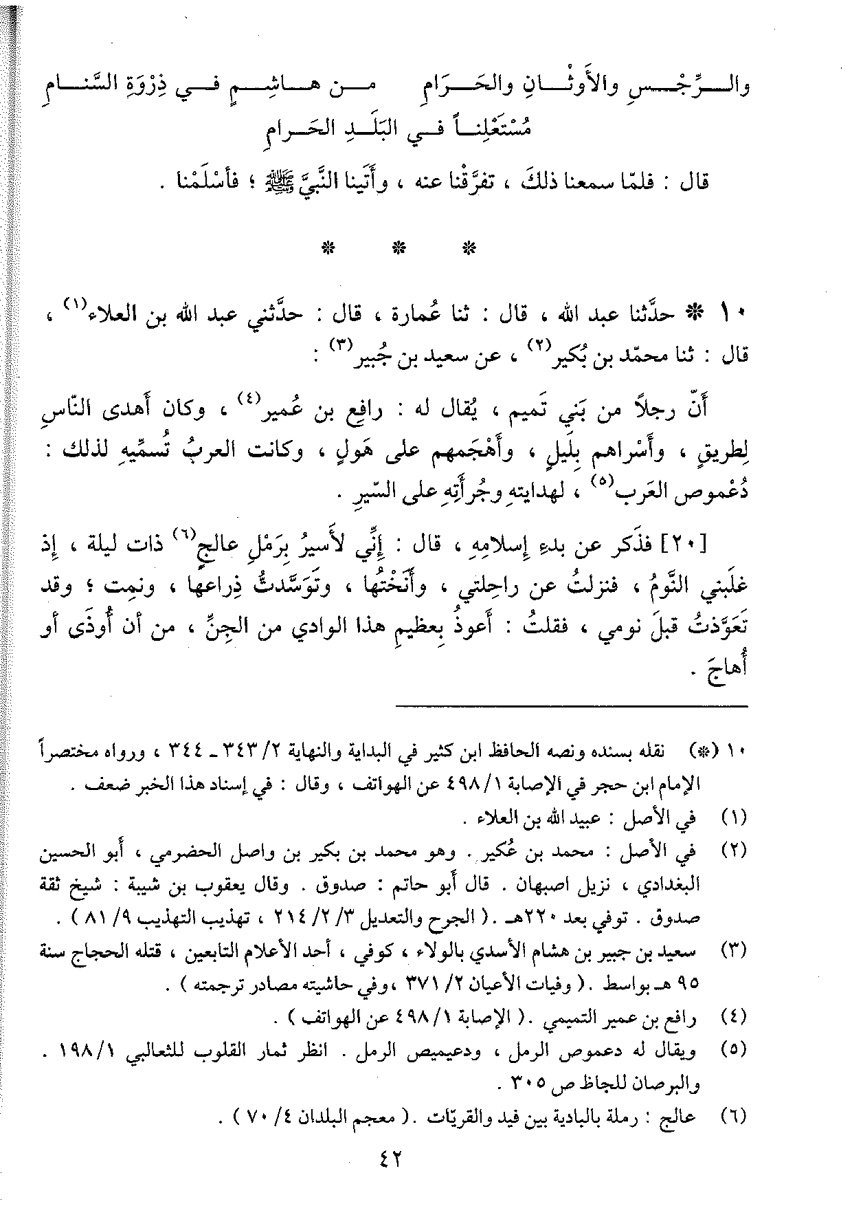 فذكر عن بدء إسلامه، قال: إني لأسير برمل عالجٍ ذات ليلة، إذ غلبني النَّوم، فنزلتُ عن راحلتي، وأنختها، وتوسَّدتُ ذراعها، ونمت؛ وقد تعوَّذتُ قبل نومي، فقلت: أعوذ بعظيم هذا الوادي من الجنِّ، من أن أُوذَى أو أًهاج.
