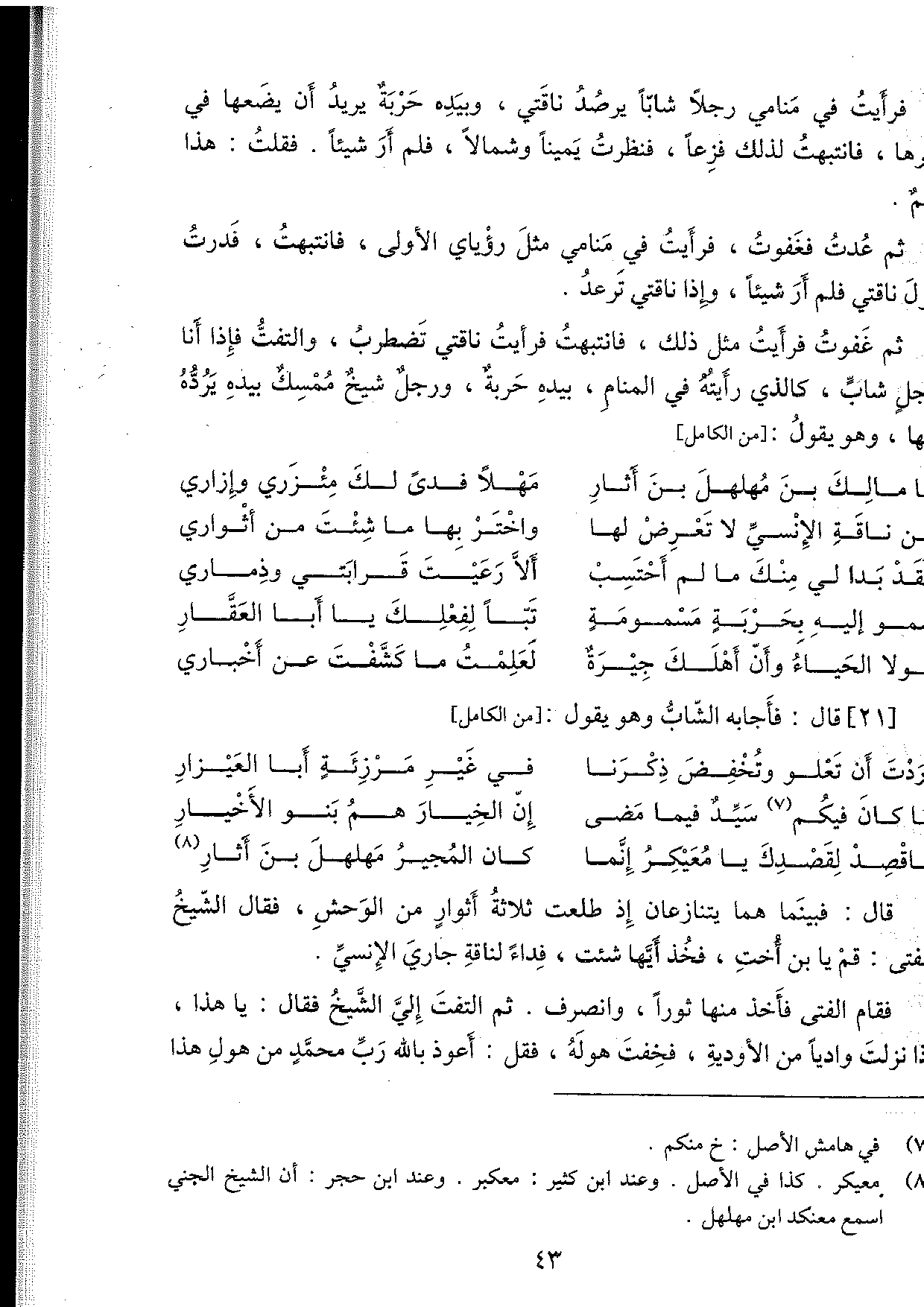 ثم غفوتُ فرأيتُ مثل ذلك، فانتبهتُ فرأيتُ ناقتي تضطرب، فالتفتُّ فإذا أنا برجلٍ شابٍّ، كالذي رأيته في المنام، بيده حربة، ورجل شيخ ممسك بيده يرُدُّه عنها، وهو يقول "من الكامل":