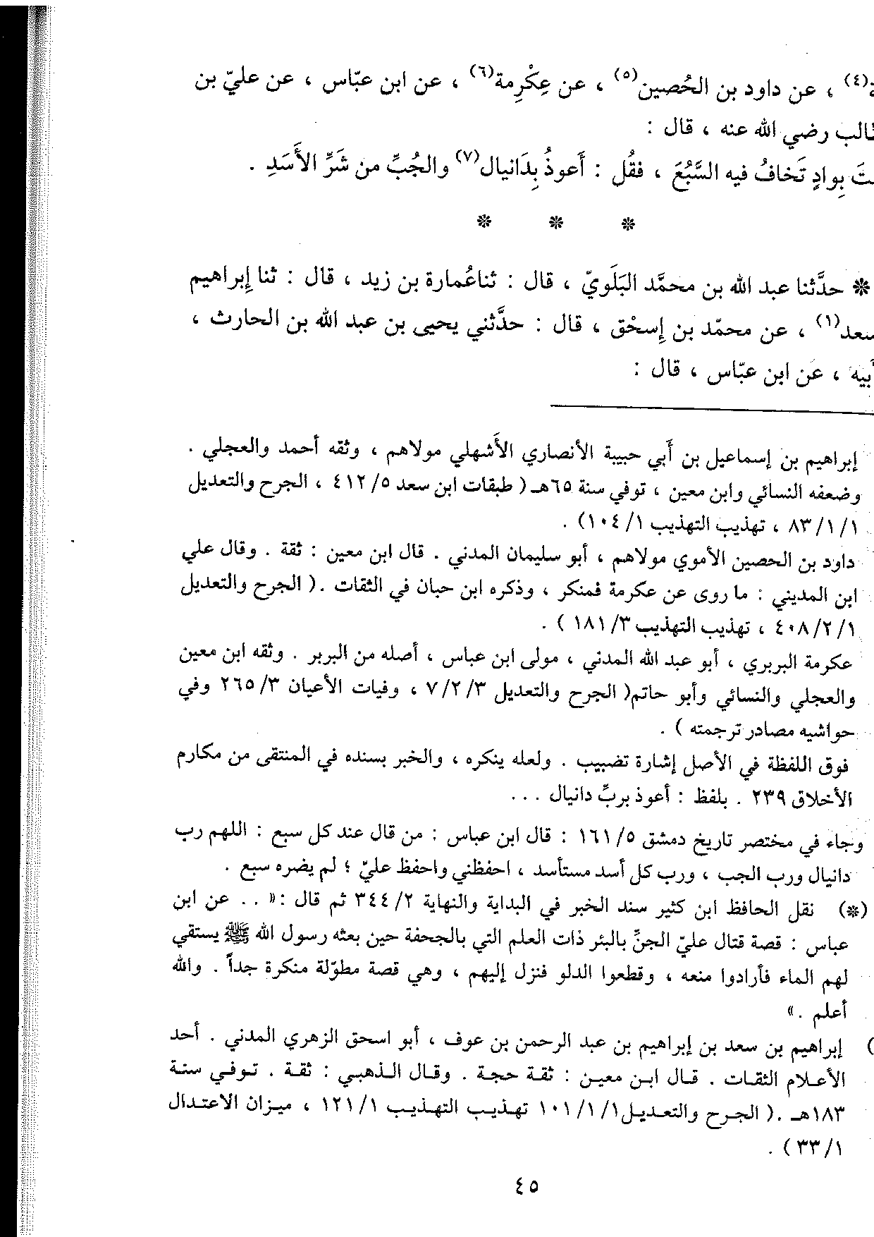 حبيبة، عن داود ابن الحصين، عن عكرمة، عن ابن عبّاس، عن عليّ بن أبي طالب رضي الله عنه، قال: إذا كنت في وادٍ تخاف فيه السبع، فقل: أعوذ بدانيال والجُبِّ من شرِّ الأسد.