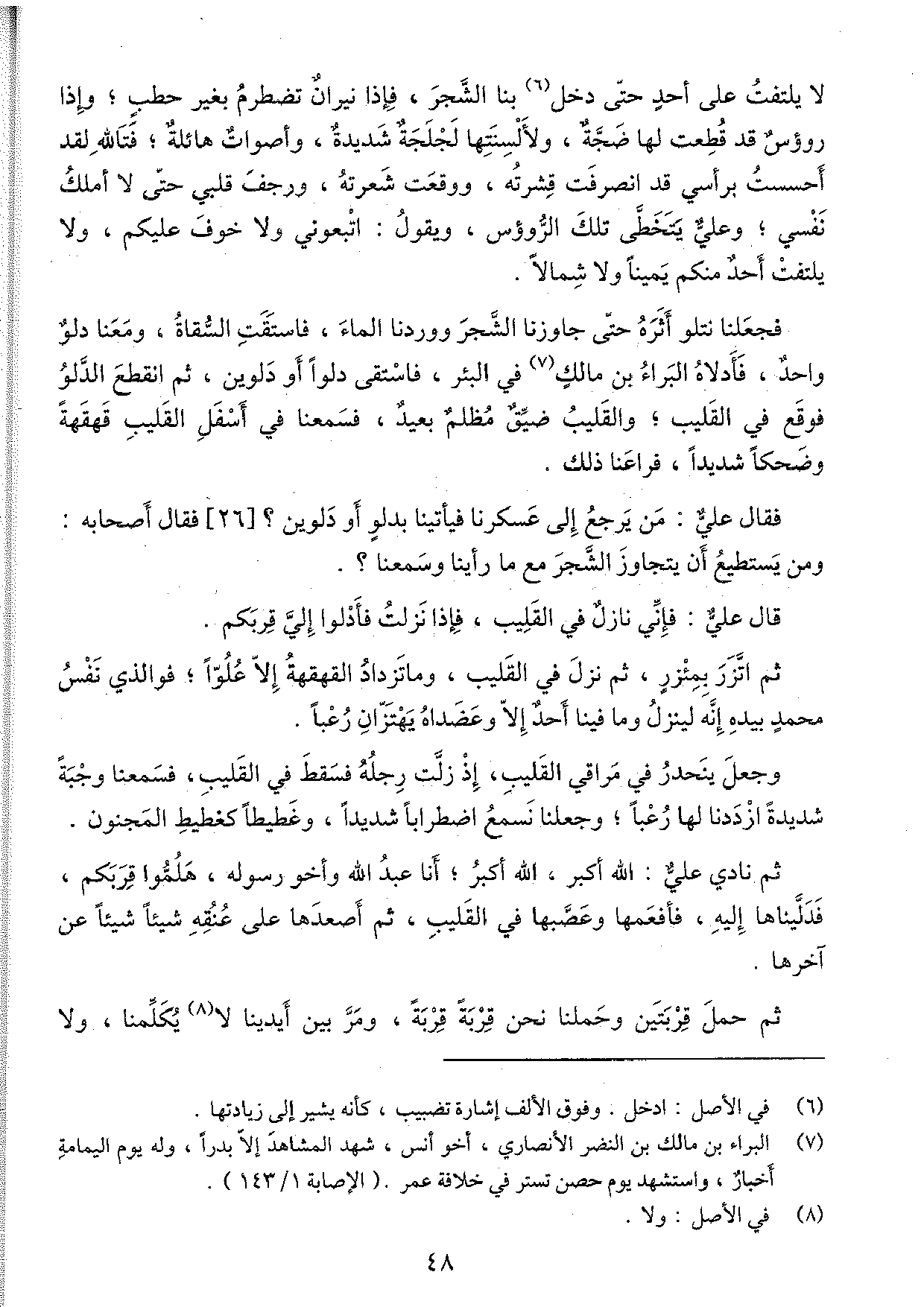 فجعلنا نتلو أثره حتى جاوزنا الشجر ووردنا الماء، فاستقتِ السُّقاة، ومعنا دلو واحد، فأدلاه البراء بن مالك في البئر، فاستسقى دلواً أو دلوين، ثم انقطع الدَّلو فوقع في القليب. والقليب ضيِّق مظلم بعيد. فسمعنا في أسفل القليب قهقهة وضحكاً شديداً، فراعنا ذلك.