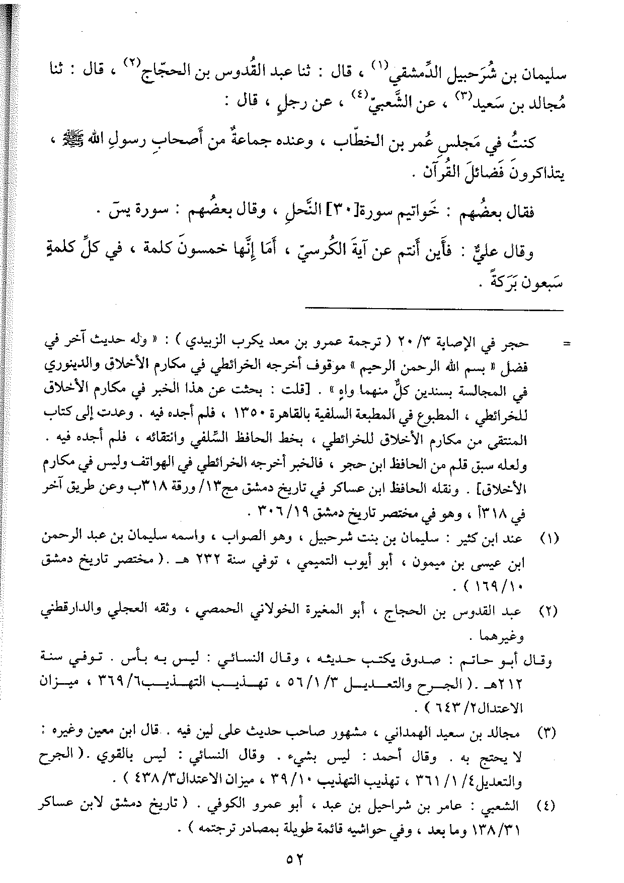سليمان بن شرحبيل الدمشقي قال: ثنا عبد القدوس بن الحجّاج، قال: ثنا مجالد بن سعيد، عن الشعبيّ، عن رجل، قال: ر بن الخطاب، وعنده جماعة من أصحاب رسول الله صلَّى الله عليه وسلَّم، يتذاكرون فضائل القرآن.