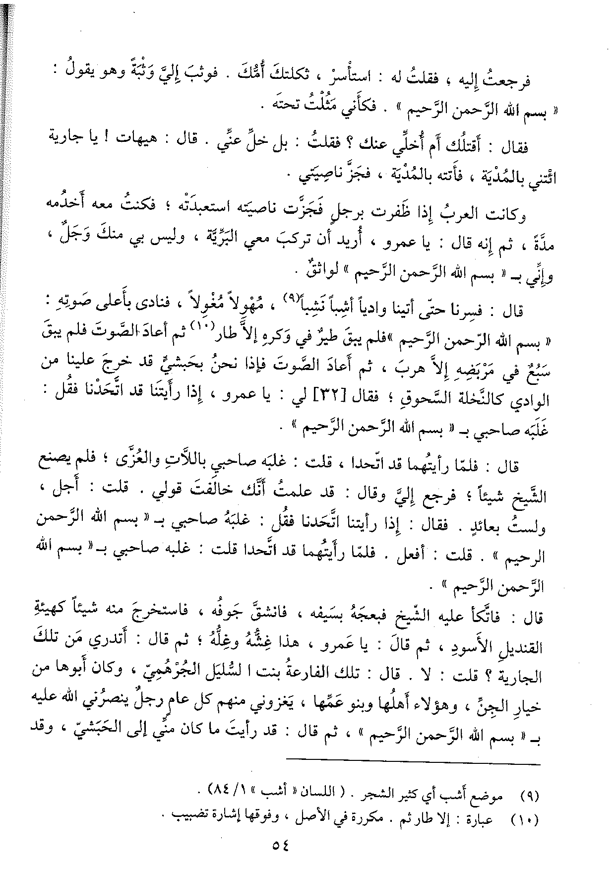 قال: فلما رأيتهما قد اتّحدا، قلت: غلبه صاحبي باللات والعزّى فلم يصنع الشيخ شيئاً: فرجع إليَّ وقال: قد علمت إنك خالفت قولي: قلتُ: أجل، ولست بعائد. فقال: إذا رأيتنا قد اتّحدنا فقل: غلبه صاحبي ب (بسم الله الرحمن الرحيم) . قلت: أفعل. فلمّا رأيتهما قد اتّحدا قلتُ: غلبه صاحبي ب (بسم الله الرحمن الرحيم) .