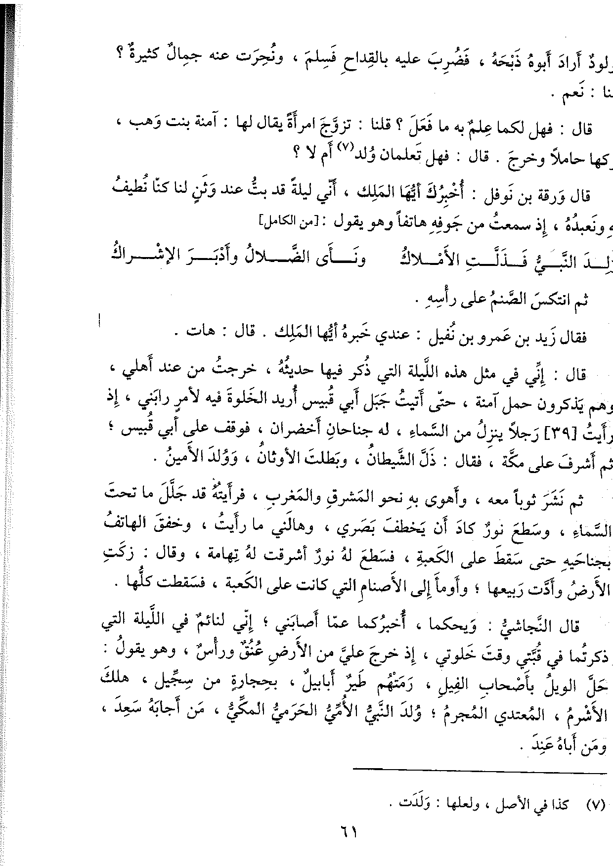قال: فهل لكما علم به ما فعل؟ قلنا: تزوَّج امرأة يقال لها: آمنة بنت وهب، تركها حاملاً وخرج. قال: فهل تعلمان وُلد أم لا؟ قال ورقة بن نوفل: أُخبرك أيّها الملك، إنّي ليلة قد بتُّ عند وثن لنا كنّا نضيف به ونعبده، إذ سمعت من جوفه هاتفاً وهو يقول "من الكامل:":