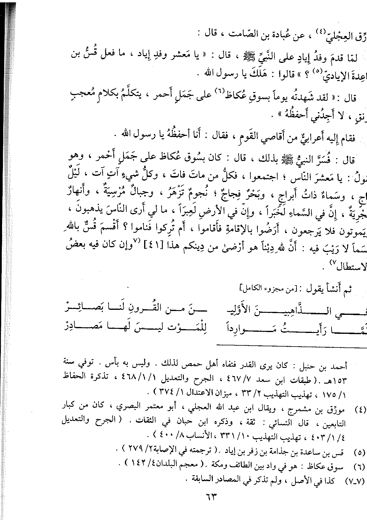 مورِّق العِجلي، عن عُبادة بن الصامت، قال: لمّا قدِم وفد أياد على النَّبيِّ صلَّى الله عليه وسلَّم قال: يا معشر وفد إياد، ما فعل قسُّ بن ساعدة الإيادي؟ قالوا: هلَكَ يا رسول الله.