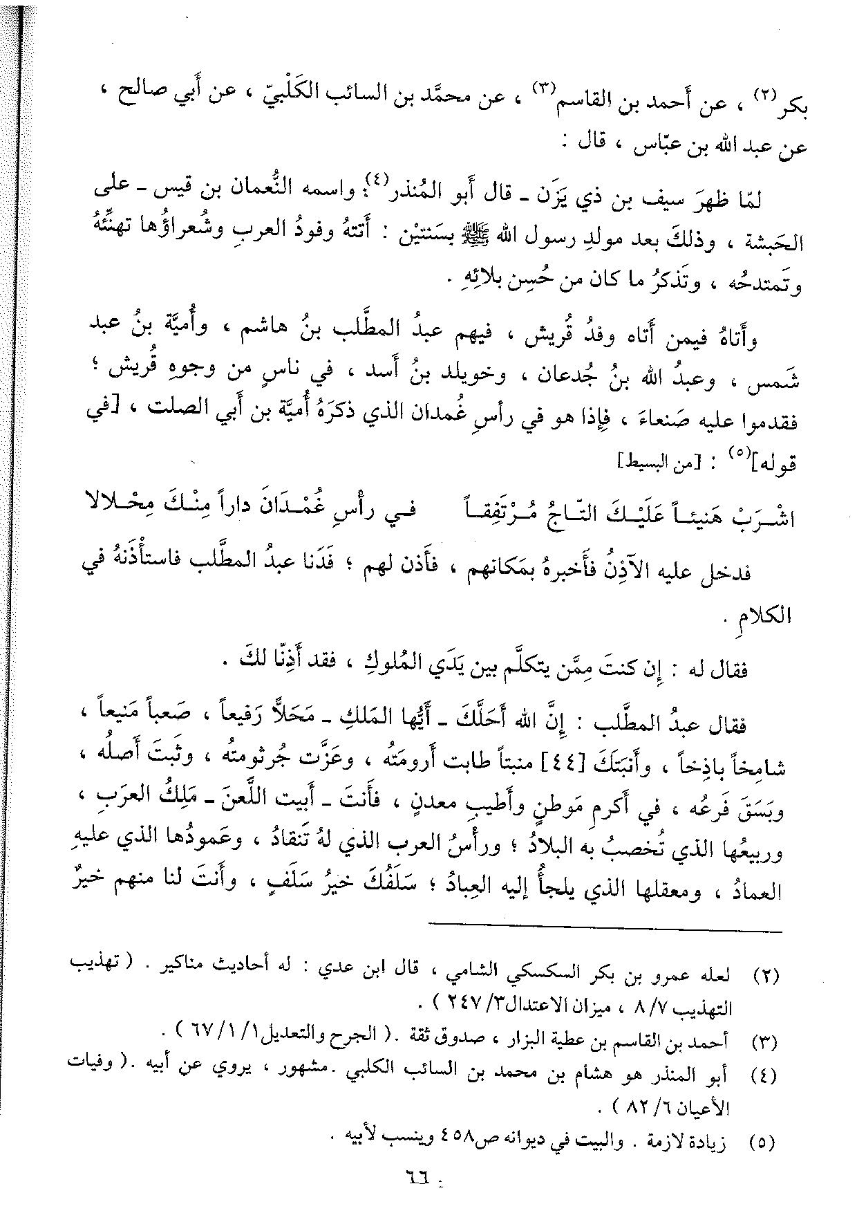 بكر، عن أحمد بن القاسم، عن محمد بن السائب الكلبيّ، عن أبي صالح، عن عبد الله بن عباس، قال: لمّا ظهر سيف بن ذي يزن "قال أبو المنذر واسمه النعمان بن قيس" على الحبشة وذلك بعد مولد رسول الله صلَّى الله عليه وسلَّم بسنتين: أتته وفود العرب وشعراؤها تهنِّئه وتمدحه، وتذكر ما كان من حُسن بلائه.