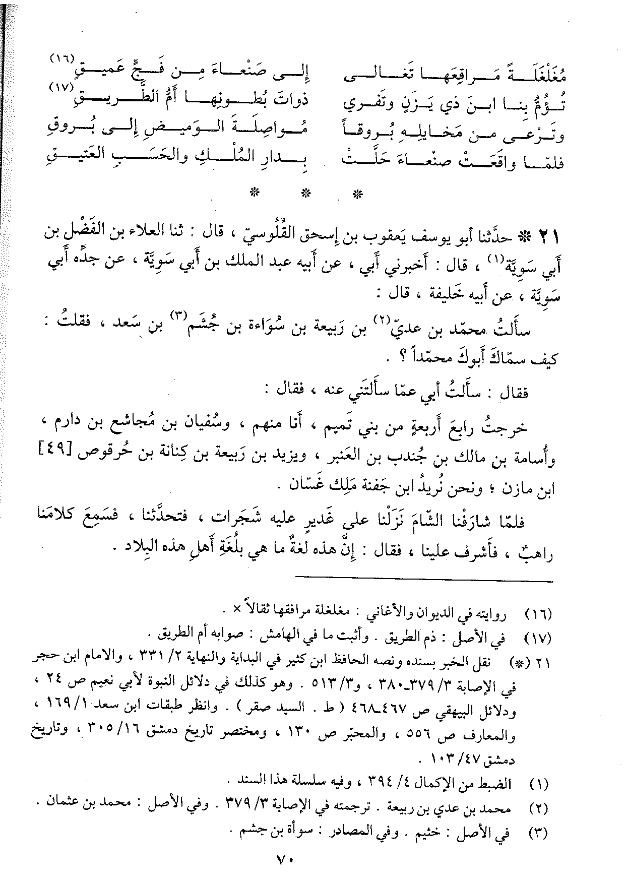 حدثنا أبو يوسف يعقوب بن إسحاق القلوسيّ، قال: ثنا العلاء بن الفضل بن أبي سويّة، قال: أخبرني أبي عن أبيه عبد الملك بن أبي سويّة، عن جدِّه أبي سويِّة، عن أبي خليفة، قال: سألت محمد بن عديّ بن ربيعة بن سواءة بن جُشم بن سعد، فقلتُ: كيف سمّاك أبوك محمداً؟ فقال: سألتُ أبي عمّا سألتني عنه، فقال: خرجتُ رابع أربعة من بني تميم، أنا منهم، وسفيان بن مُجاشع بن دارم، وأسامة بن مالك بن جُندب بن العنبر، ويزيد بن ربيعة بن كنانة بن حرقوص ابن مازن؛ ونحن نريد ابن جفنة ملك غسّان.