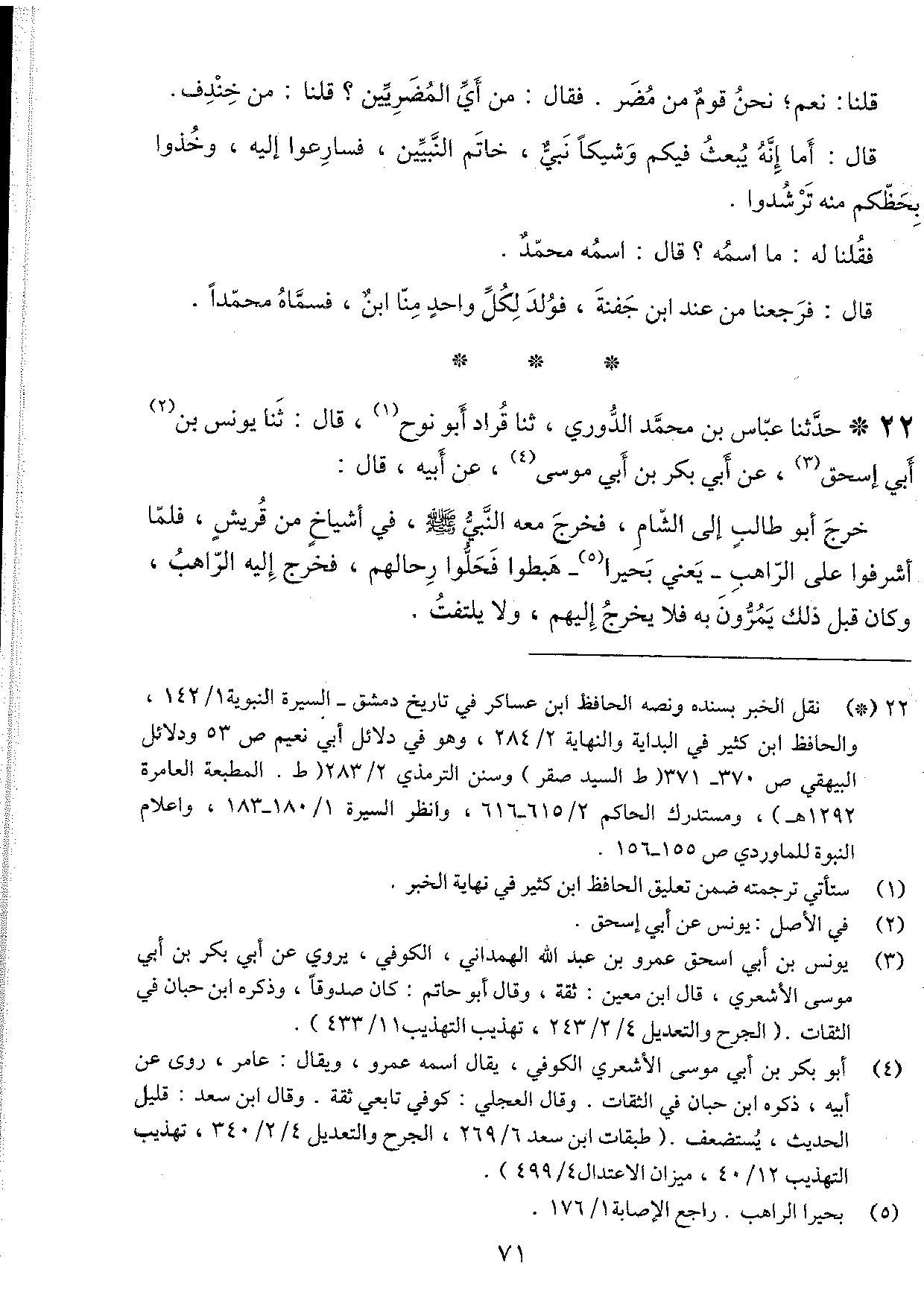 حدثنا عباس بن محمد الدُّوري، ثنا قرَاد أبو نوح، قال: ثنا يونس بن أبي إسحاق، عن أبي بكر بن أبي موسى، عن أبيه، قال: خرج أبو طالب إلى الشام، فخرج معه النبيِّ صلَّى الله عليه وسلَّم في أشياخ من قريش، فلما أشرفوا على الرَّاهب "يعني بحيرا" هبطوا فحلّوا رحالهم، فخرج إليهم الراهب، وكان قبل ذلك يمرُّون به فلا يخرج إليهم، ولا يلتفت.
