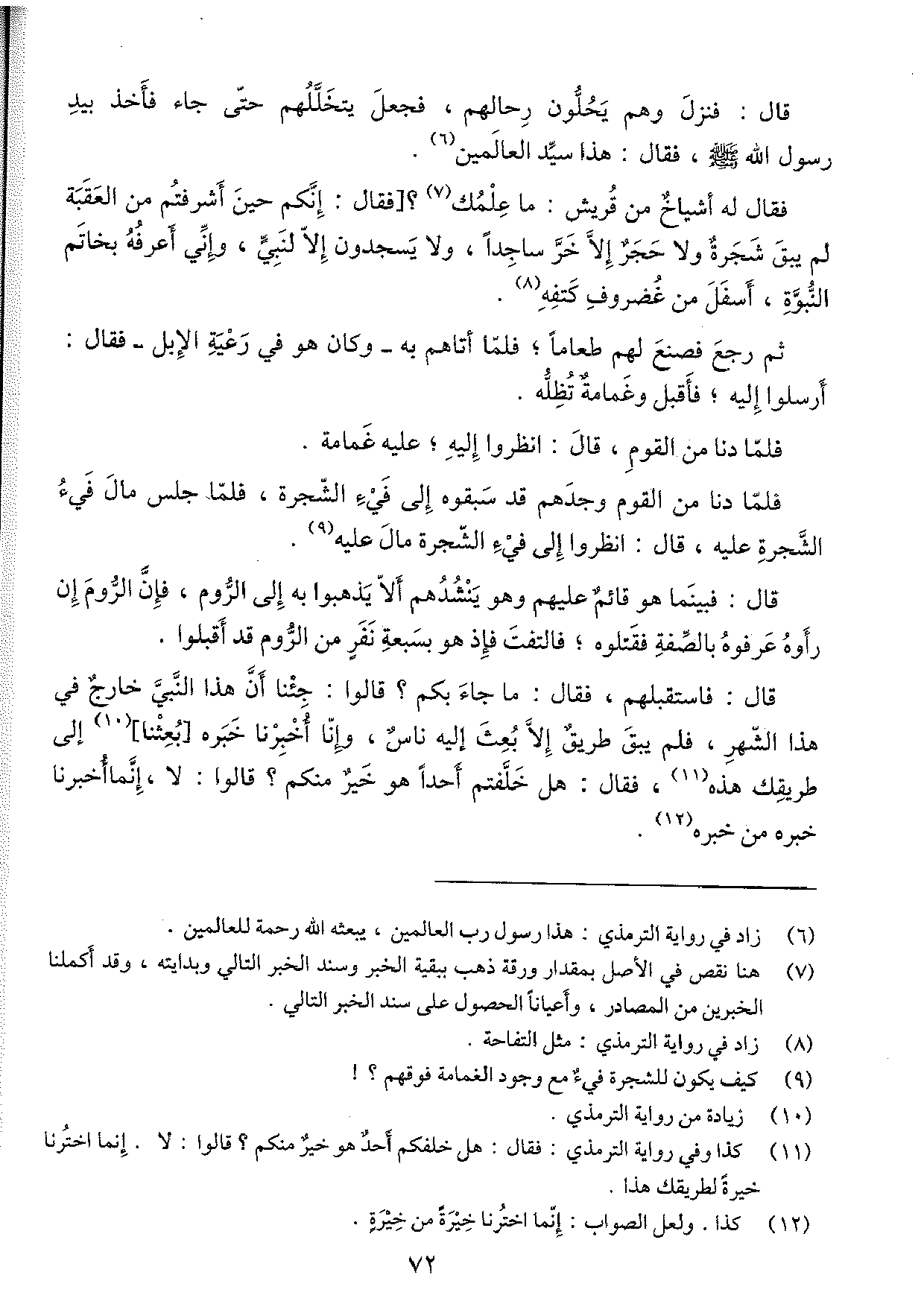 فقال له أشياخ من قريش: وما علمُك؟ قال: إنّكم حين أشرفتم من العَقَبَة لم يبق شجرة ولا حجر إلاَّ خرَّ ساجداً، ولا يسجدون إلاّ لنبيٍّ، وإني أعرفه بخاتم النبوَّة، أسفل من غضروف كتفه.