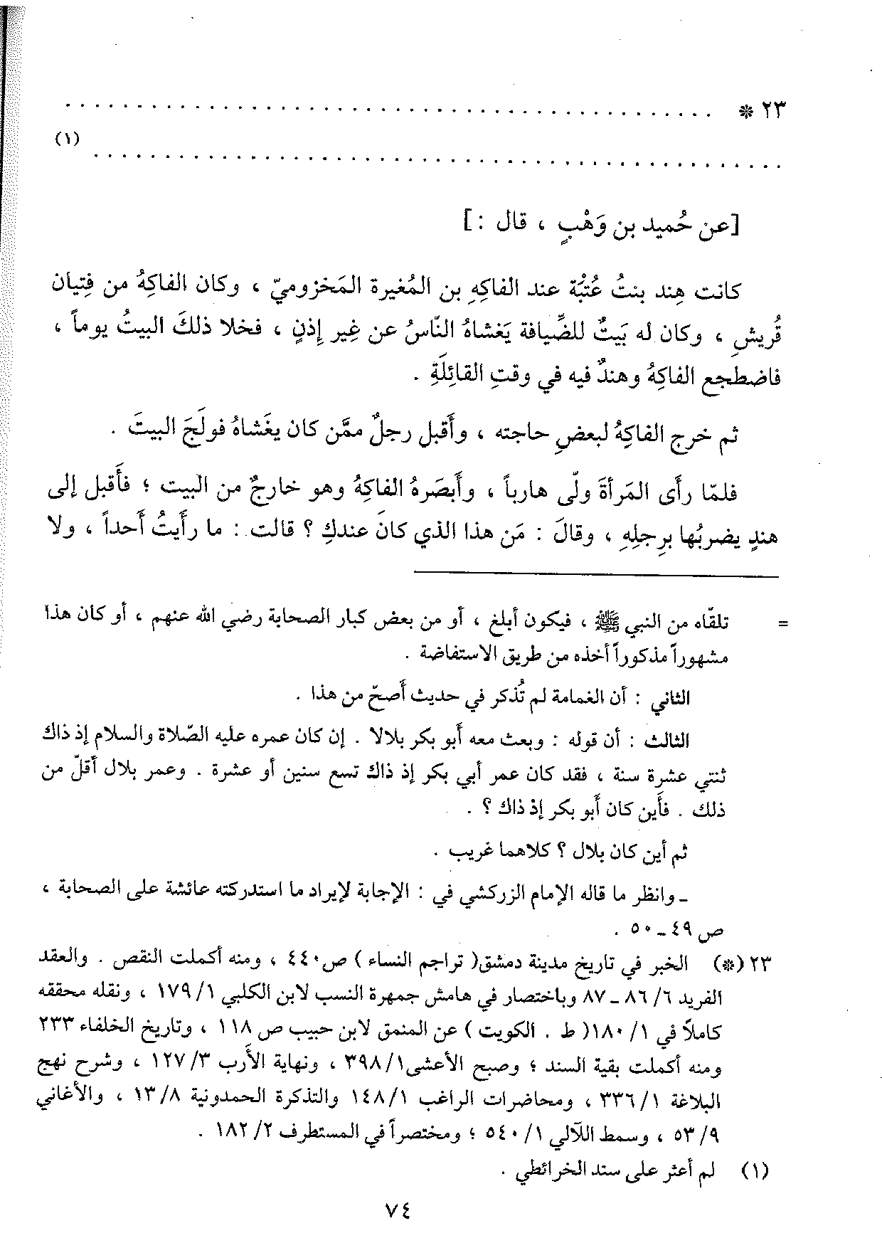 23ذ كانت هند بنت عُتبة عند الفاكه بن المُغيرة المخزومي، وكان الفاكه من فتيان قريش، وكان له بيت للضيافة يغشاه الناس عن غير إذن، فخلا ذلك البيت يوماً. فاضطجع الفاكه وهند فيه في وقت القائلة.