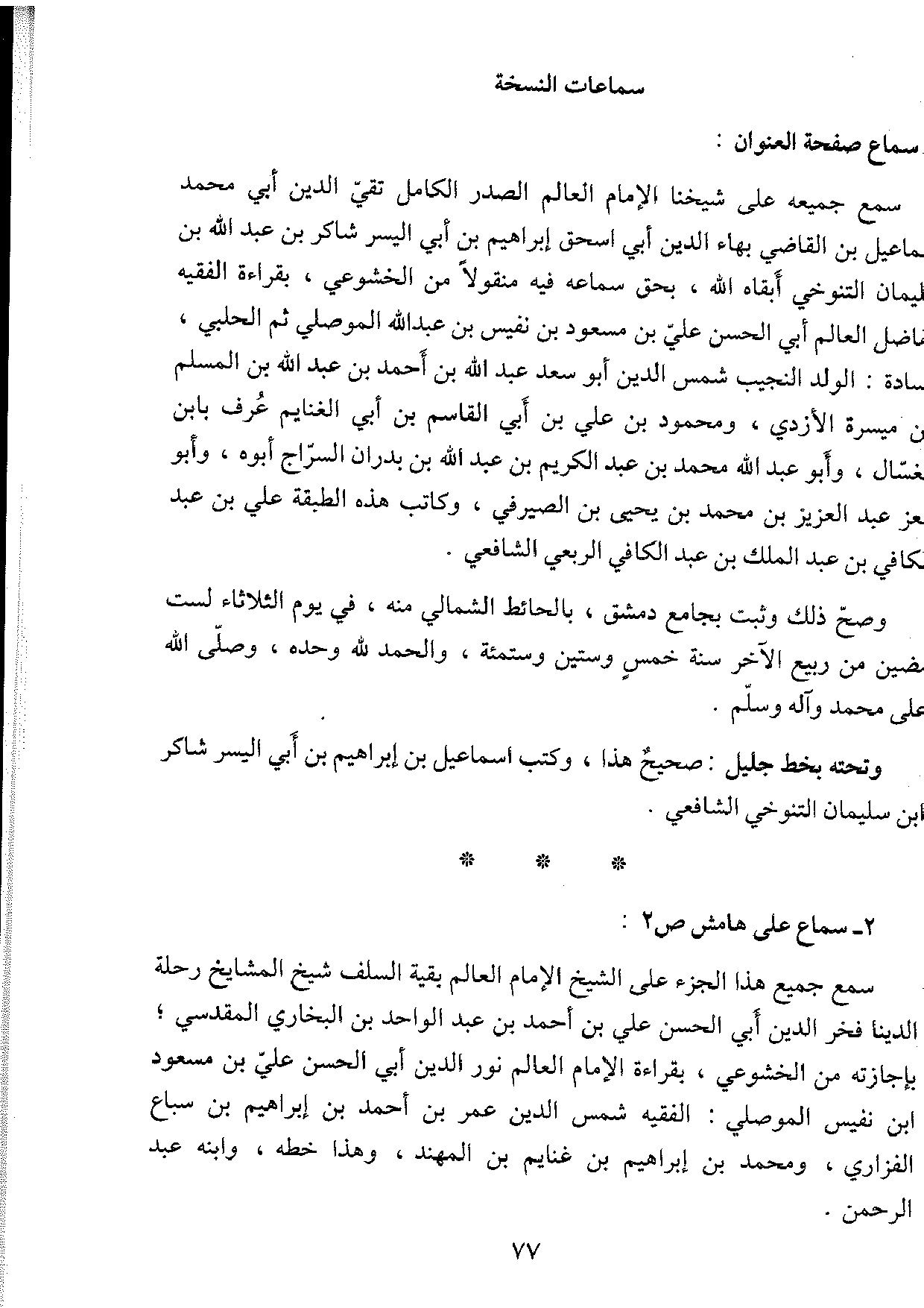 سمع جميعه على شيخنا الإمام العالم الصدر الكامل تقيّ الدين أبي محمد إسماعيل بن القاضي بهاء الدين أبي إسحاق إبراهيم بن أبي اليسر شاكر بن عبد الله ابن سليمان التنوخي أبقاه اله بحق سماعه فيه منقولاً من الخشوعي بقراءة الفقيه الفاضل العالم أبي الحسن عليّ بن مسعود بن نفيس بن عبد الله الموصلي ثم الحلبي، السادة، الولد النجيب شمس الدين أبو سعد عبد الله بن أحمد بن عبد الله بن المسلم بن ميسرة الأزدي، ومحمود بن علي بن أبي القاسم بن أبي الغنايم عُرف بابن الغسّال، وأبو عبد الله محمد بن عبد الكريم بن عبد الله بن بدران السرّاج أبوه، وأبو العز عبد العزيز بن محمد بن يحيى بن الصيرفي، وكاتب هذه الطبقة علي بن عبد الكافي بن عبد الملك بن عبد الكافي الربعي الشافعي. وصحّ ذلك وثبت بجامع دمشق، بالحائط الشمالي منه في يوم الثلاثاء لست مضين من ربيع الآخر سنة خمس وستين وستمئة، والحمد لله وحده، وصلَّى الله على محمد وعلى آله وسلَّم.